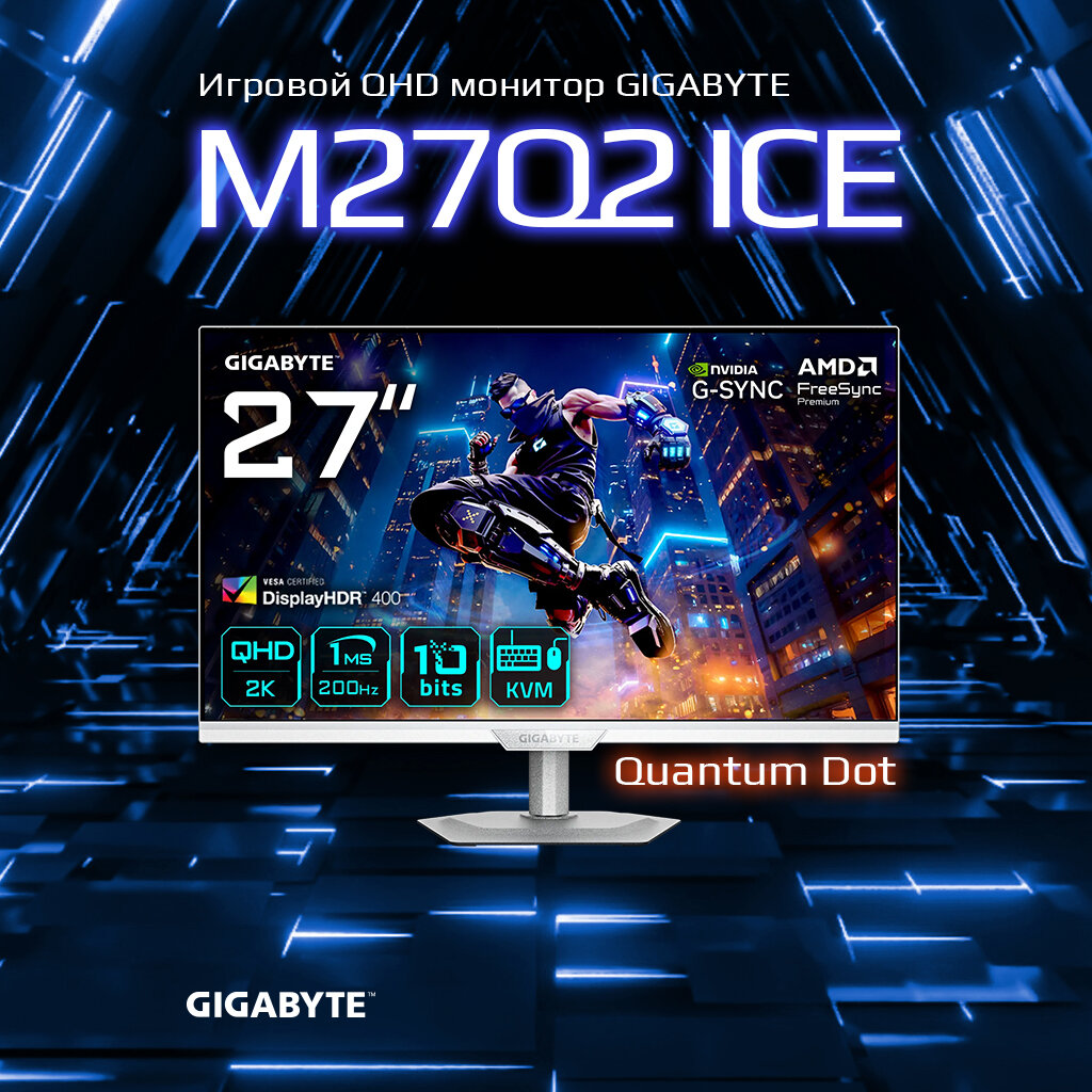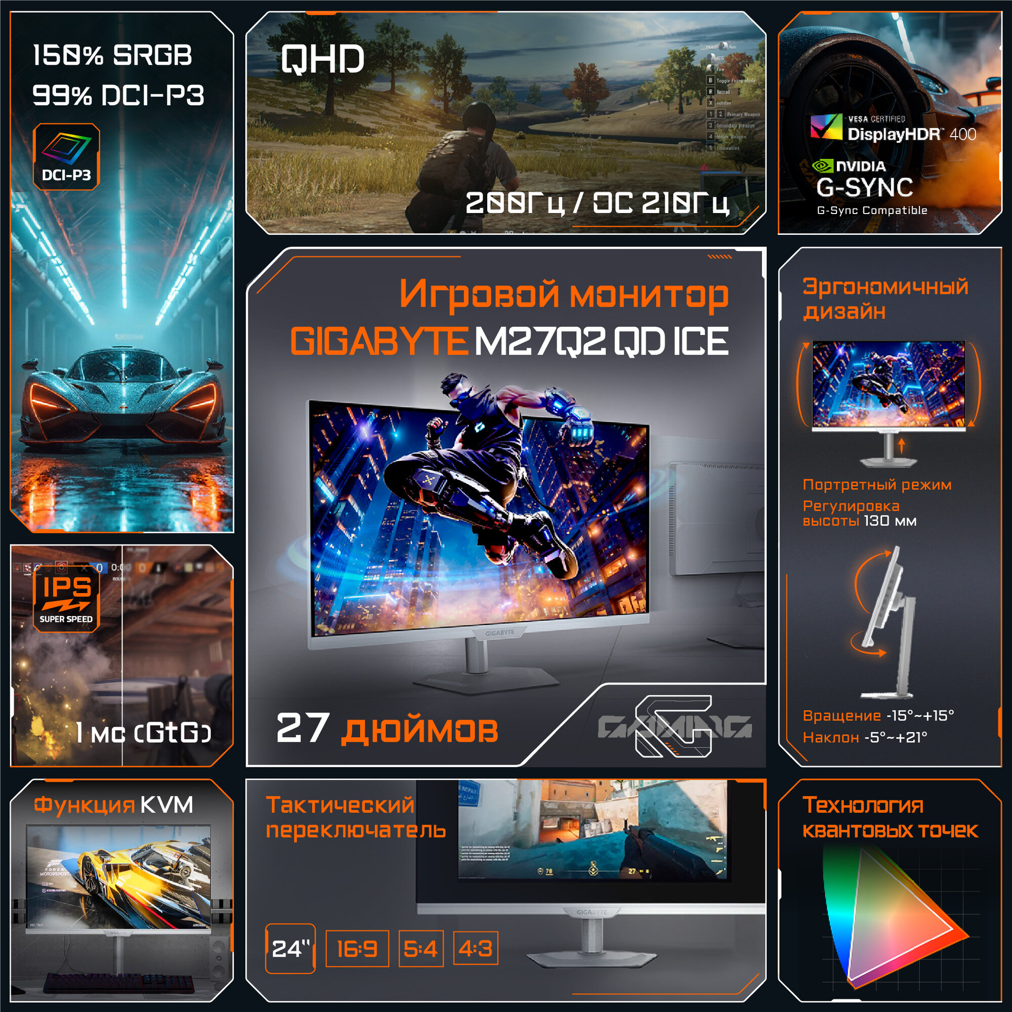 **Монитор Gigabyte M27Q2 ICE EK: высокое качество изображения и широкие возможности подключения** Погрузитесь в мир ярких и чётких изображений с монитором Gigabyte M27Q2 ICE EK! Диагональ экрана — 27 дюймов, разрешение — 2560 x 1440 пикселей — обеспечивают детализированное и реалистичное изображение. **Почему стоит выбрать Gigabyte M27Q2 ICE EK?** * **IPS-матрица:** широкие углы обзора (178°/178°) позволяют наслаждаться качественным изображением с любого ракурса. * **Высокая частота обновления (200 Гц) и время отклика (1 мс):** идеально подходят для динамичных игр и видео — движения на экране будут плавными и чёткими. * **Яркость 350 кд/м² и контрастность 1000:1:** обеспечивают глубокие чёрные и яркие цвета, делая изображение более насыщенным и живым. * **Разнообразные варианты подключения:** монитор оснащён несколькими интерфейсами, включая 2xHDMI 2.0, DP 1.4 и USB Type-C, а также тремя портами USB 3.2. Это позволяет легко подключить различные устройства и организовать удобное рабочее пространство. * **Функция Pivot:** возможность поворота экрана для комфортной работы в портретном режиме. С монитором Gigabyte M27Q2 ICE EK ваше рабочее место или игровая зона станут ещё более функциональными и комфортными!