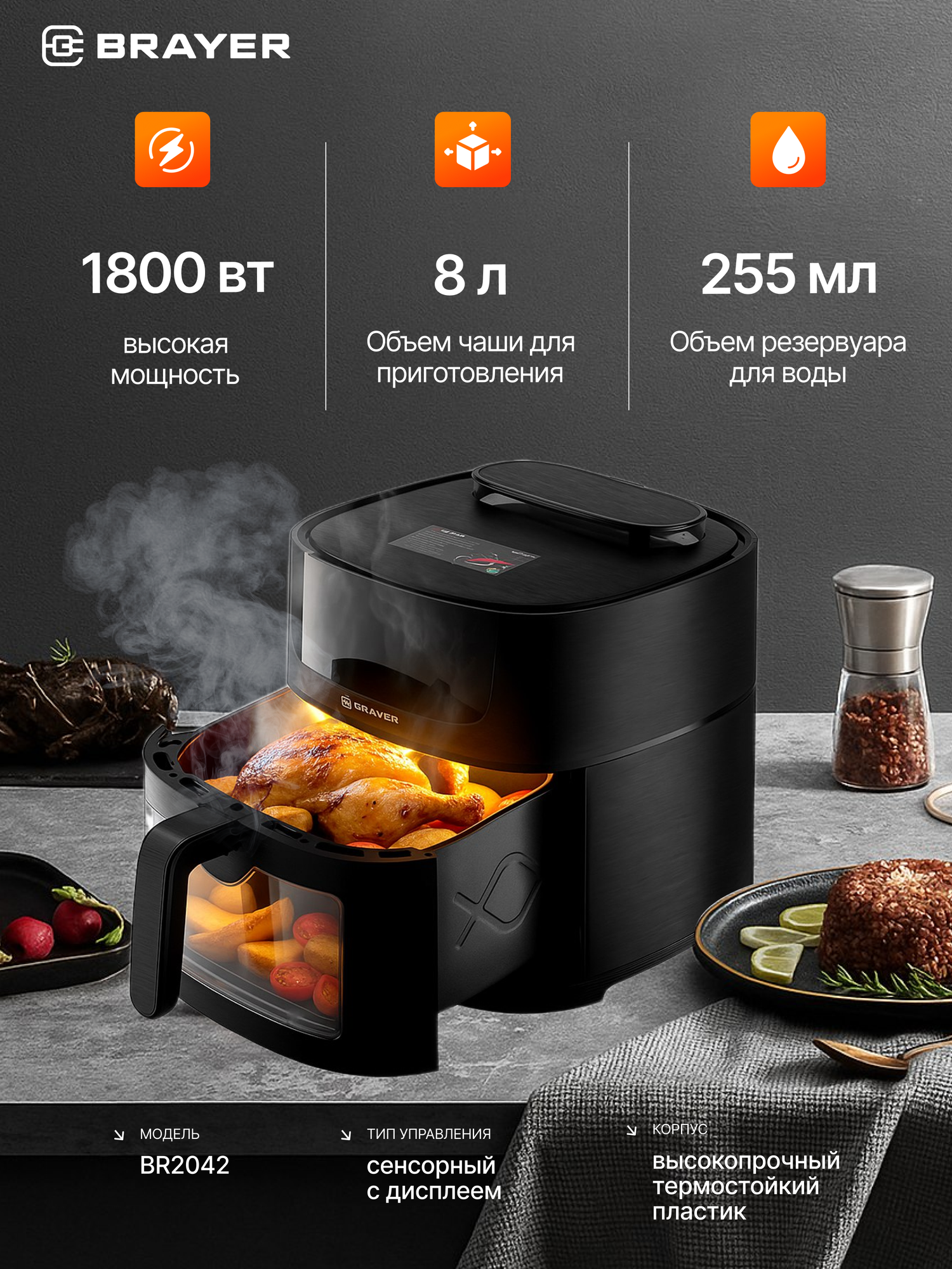 Откройте для себя новые горизонты кулинарии с аэрогрилем Brayer BR2042! Этот многофункциональный прибор станет незаменимым помощником на вашей кухне, позволяя готовить вкусные и полезные блюда с минимальным количеством масла.