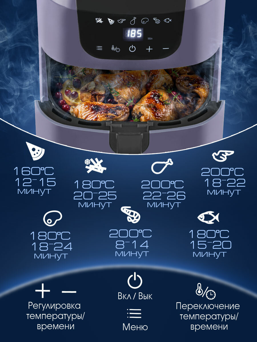 Этот компактный аэрогриль легко поместится даже на небольшой кухне, а его стильный дизайн гармонично впишется в любой интерьер. Благодаря своей многофункциональности, он заменит вам сразу несколько кухонных приборов: духовку, фритюрницу, микроволновую печь и гриль.