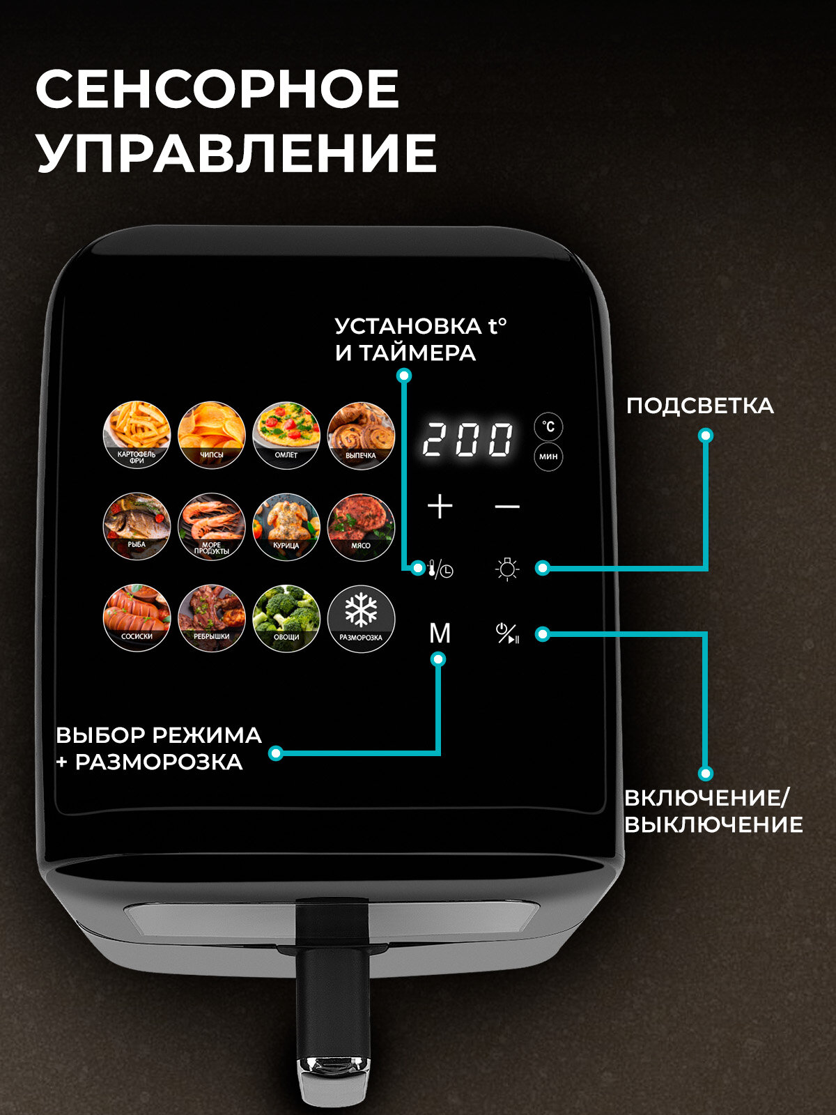 Этот аэрогриль станет незаменимым помощником на вашей кухне, позволяя готовить разнообразные блюда: от сочных стейков и хрустящей картошки фри до ароматной выпечки и овощей-гриль. Интуитивно понятное управление и удобный таймер с автоматическим отключением обеспечат максимальный комфорт в использовании.