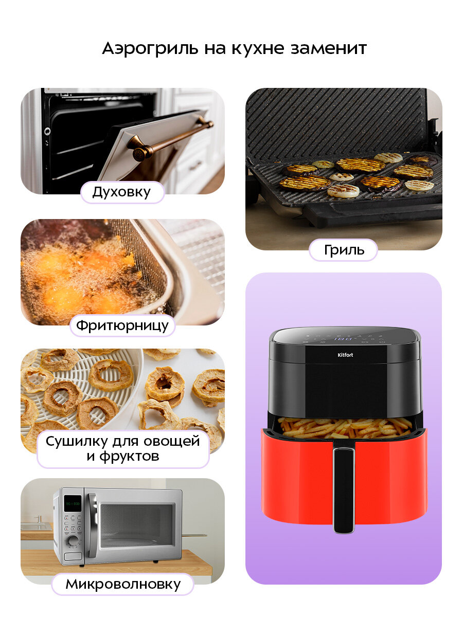 С аэрогрилем Kitfort KT-2291 вы сможете наслаждаться хрустящей корочкой и сочной мякотью ваших любимых продуктов. Принцип работы аэрогриля основан на циркуляции горячего воздуха, что обеспечивает равномерное прожаривание со всех сторон. Забудьте о пригоревшей или непропеченной еде – с этим устройством каждое блюдо будет идеальным.