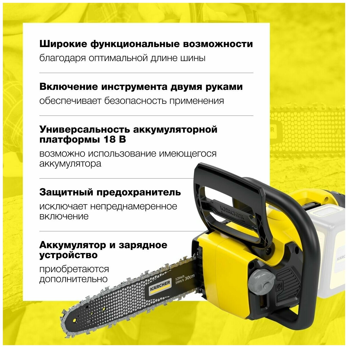 Аккумуляторная цепная пила Karcher CNS 18-30 Battery идеально подходит для обрезки веток, распиловки небольших деревьев и заготовки дров для камина. Это незаменимый инструмент для любого дачника или владельца загородного дома, который ценит свое время и предпочитает качественную технику.