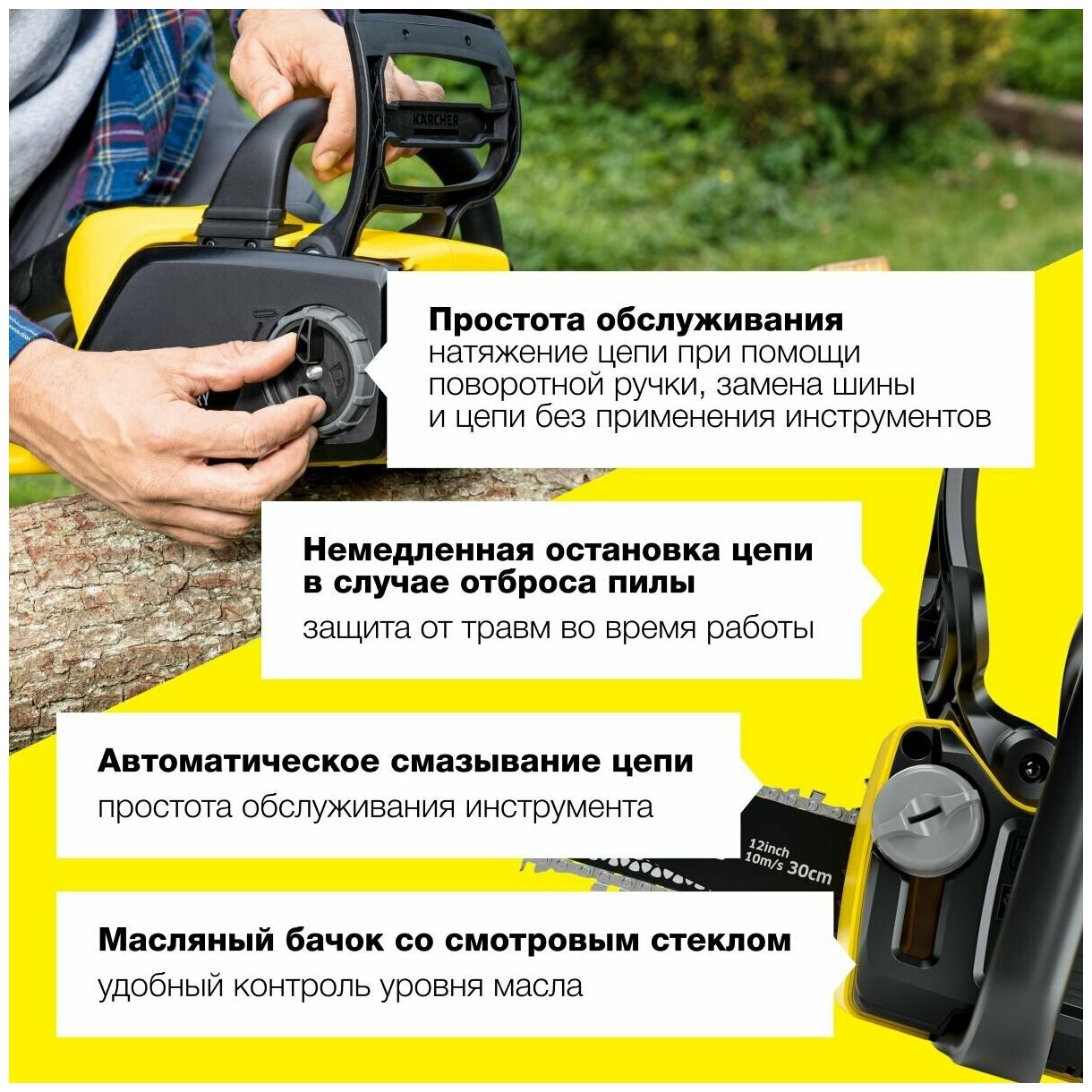 Почувствуйте свободу движения и высокую производительность с аккумуляторной цепной пилой Karcher! Простота в использовании и отсутствие вредных выбросов делают ее идеальным выбором для тех, кто заботится об окружающей среде.