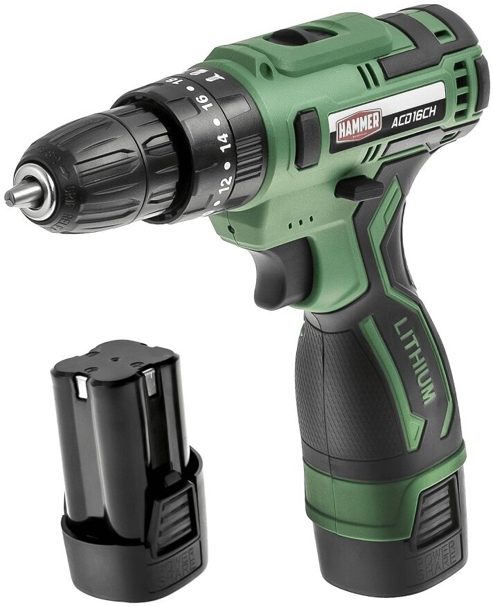 Аккумуляторная дрель ударная Hammer ACD16CH 16В 2x 2Ач LiION 10мм 0-350/0-1350об/мин, 30 Нм, кейс [824160]