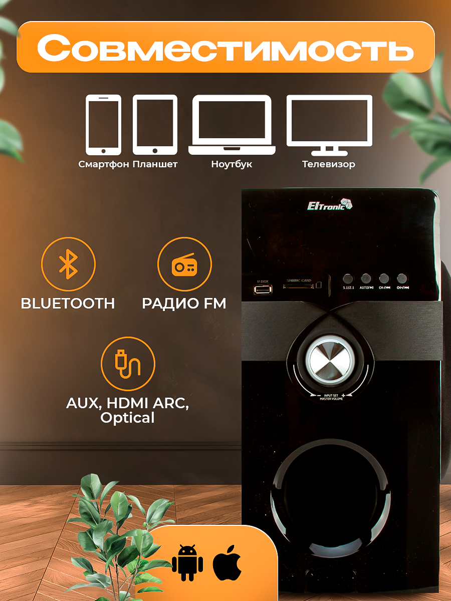 Забудьте о сложных настройках и запутанных проводах! Eltronic 3420 5.1 Home Sound оснащена технологией Bluetooth, что позволяет легко и быстро подключать ваши мобильные устройства, такие как смартфоны, планшеты и ноутбуки. Наслаждайтесь беспроводной свободой и транслируйте любимую музыку без ограничений.