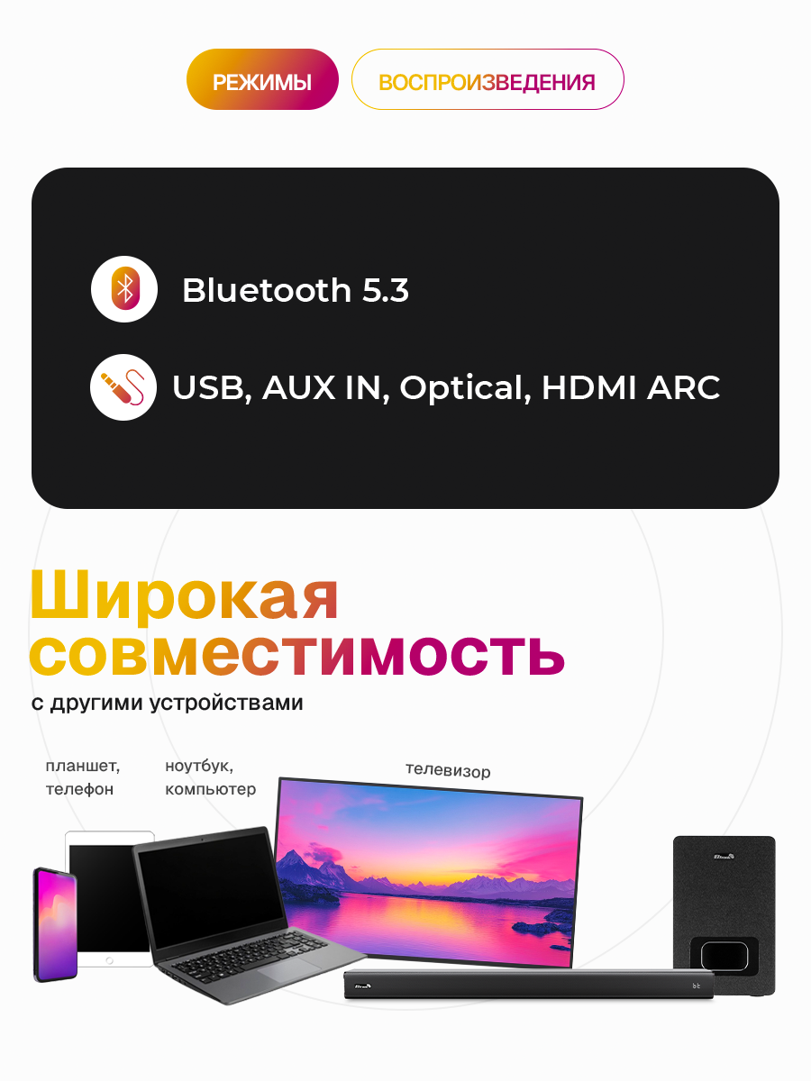 Почувствуйте мощь настоящего звука с Eltronic Soundbar 2.1. Эта акустическая система позволит вам наслаждаться любимым контентом с невероятной глубиной и детализацией, будь то захватывающий боевик или любимый музыкальный трек.
