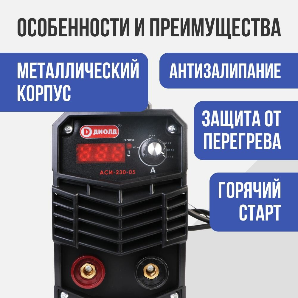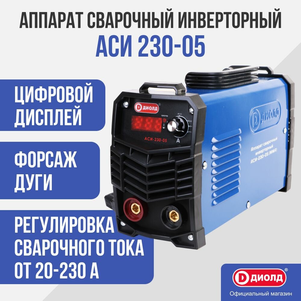 Аппарат сварочный инверторный диолд АСИ-230-05 надежный и легкий сварочный аппарат, который подходит для работ на даче, стройке, в гараже, на производстве и в автомастерской. Аппарат обеспечивает сварку стали толщиной от 1 мм до 5 мм электродом диаметром от 1,6 мм до 5 мм. Функциональные возможности: