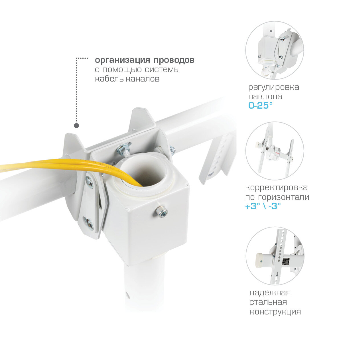 Продуманная конструкция гарантирует простоту установки и надежность фиксации телевизора. Регулируемая высота позволяет адаптировать кронштейн под различные размеры помещений и предпочтения в просмотре.