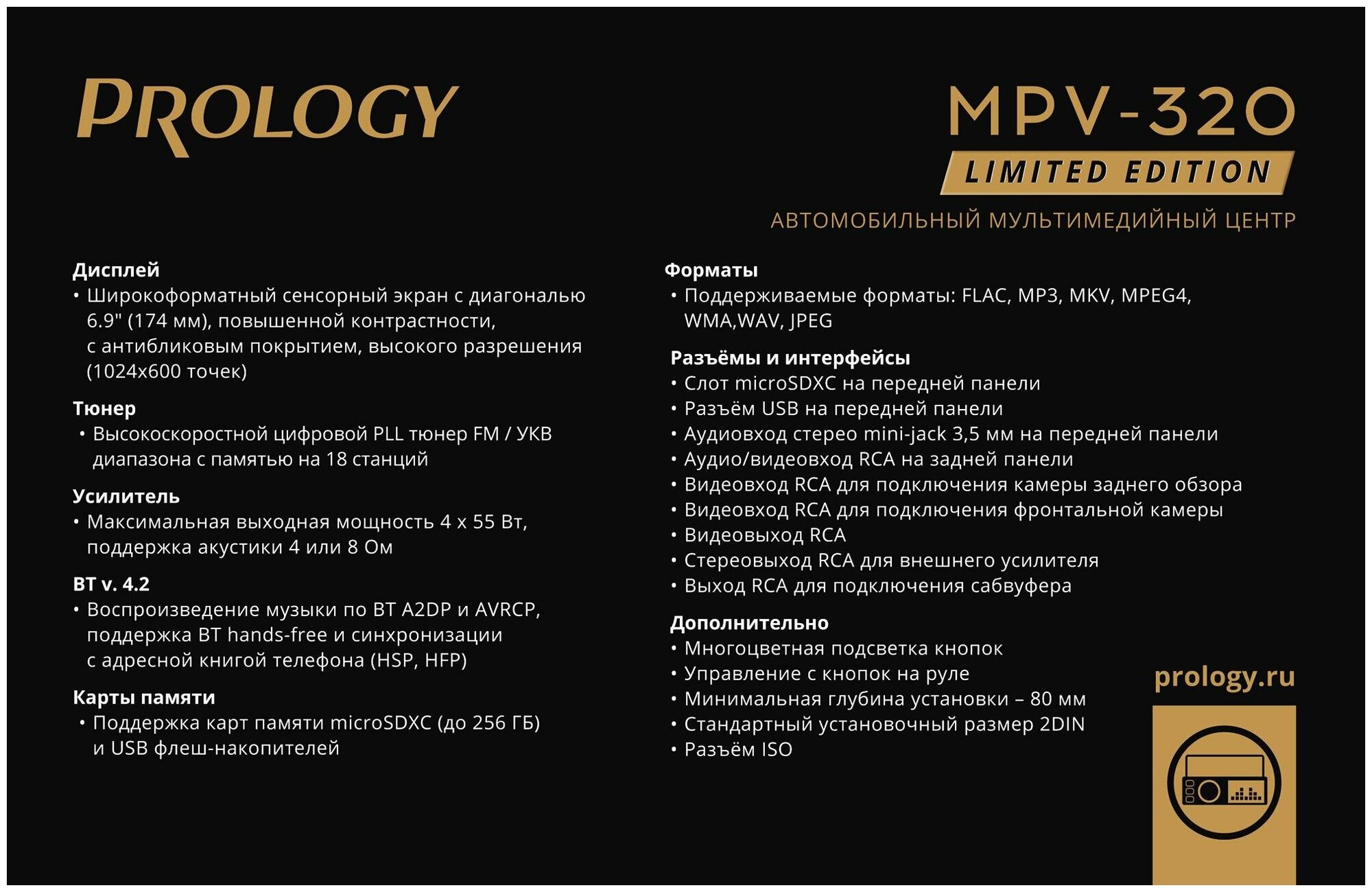 Автомагнитола Prology MPV-320 – это современное решение для тех, кто ценит качественный звук и удобство в использовании во время вождения. Эта автомагнитола создана для того, чтобы сделать каждую поездку приятнее и интереснее, наполняя салон автомобиля любимой музыкой и информацией.
