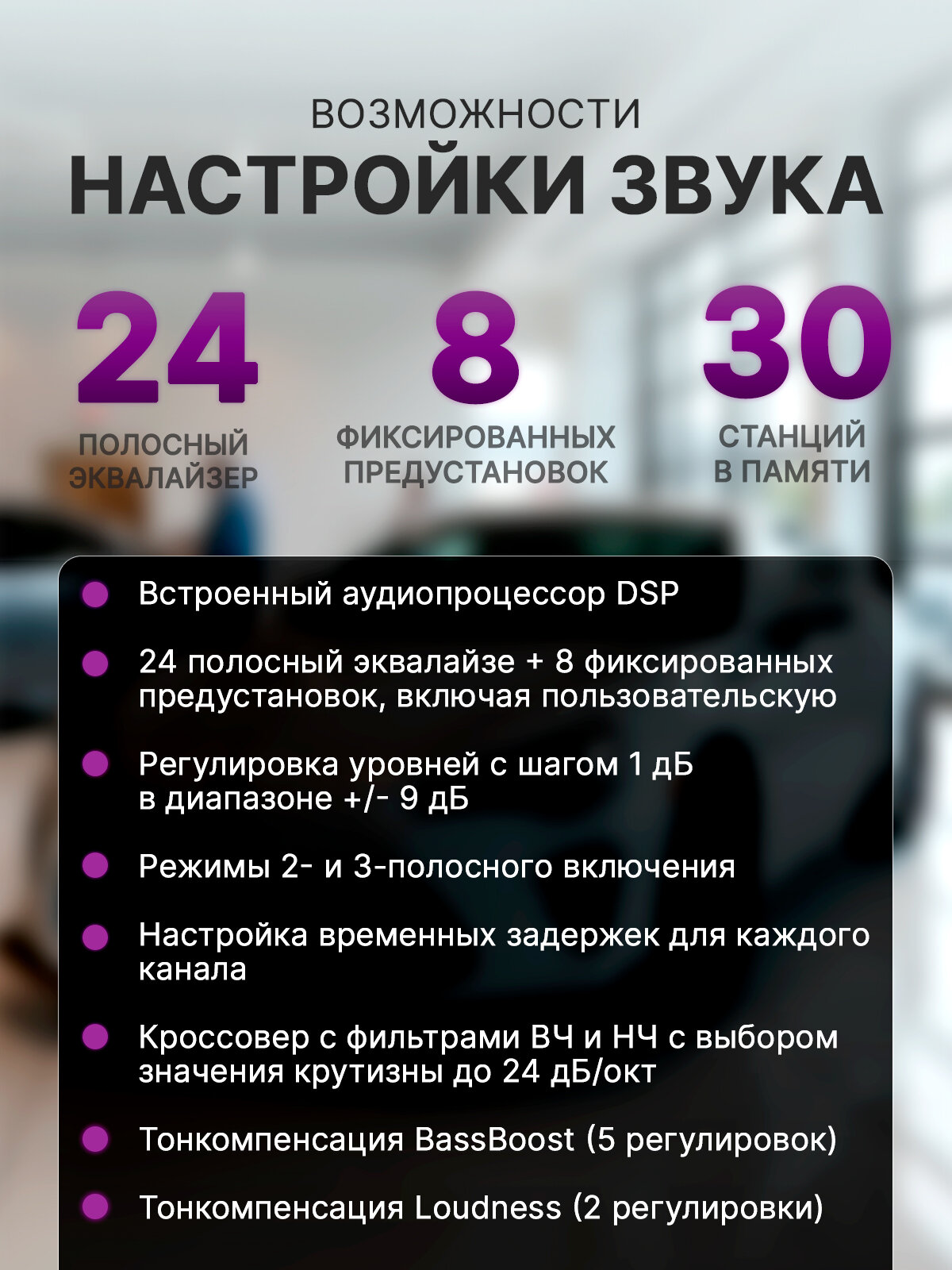 Простое и интуитивно понятное управление делает использование этой автомагнитолы максимально комфортным. Удобное расположение кнопок и информативный дисплей позволяют легко переключаться между функциями и настраивать звук по вашему вкусу. Благодаря встроенному DSP-процессору, вы сможете настроить звучание в соответствии с вашими предпочтениями и особенностями акустики вашего автомобиля, получая более насыщенный и детализированный звук.