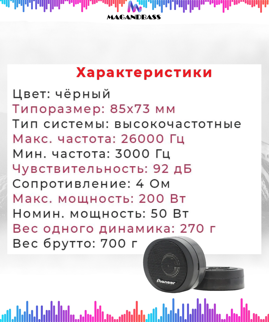 Улучшите звучание вашей автомобильной аудиосистемы с помощью высокочастотных динамиков Pioneer TS-S20! Этот комплект, состоящий из двух твитеров, позволит вам насладиться кристально чистыми высокими частотами и добавить глубину и реалистичность в любимые музыкальные треки во время вождения.
