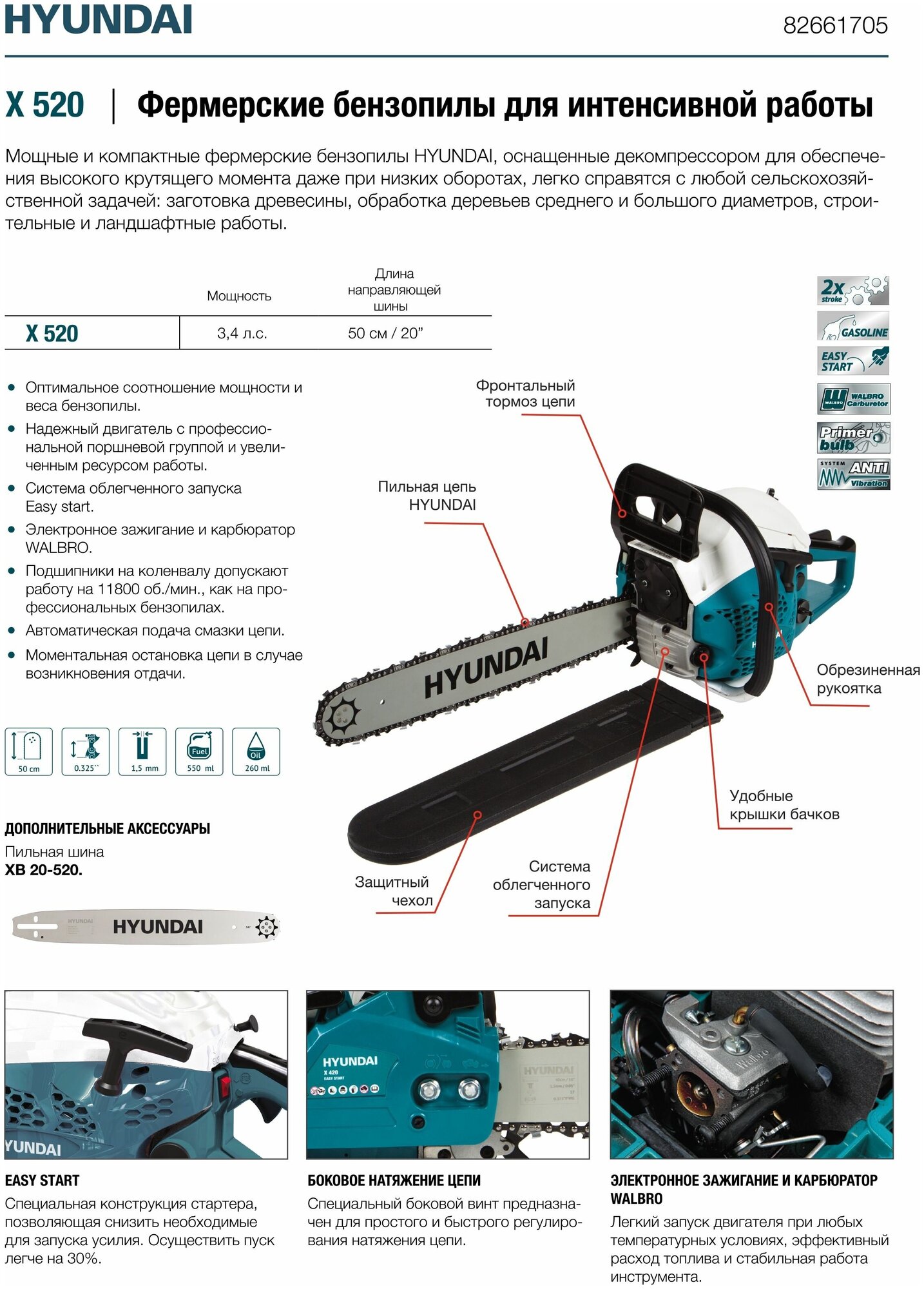 Не упустите возможность приобрести качественную бензопилу по выгодной цене! С Hyundai X 520 вы всегда будете готовы к любым вызовам.