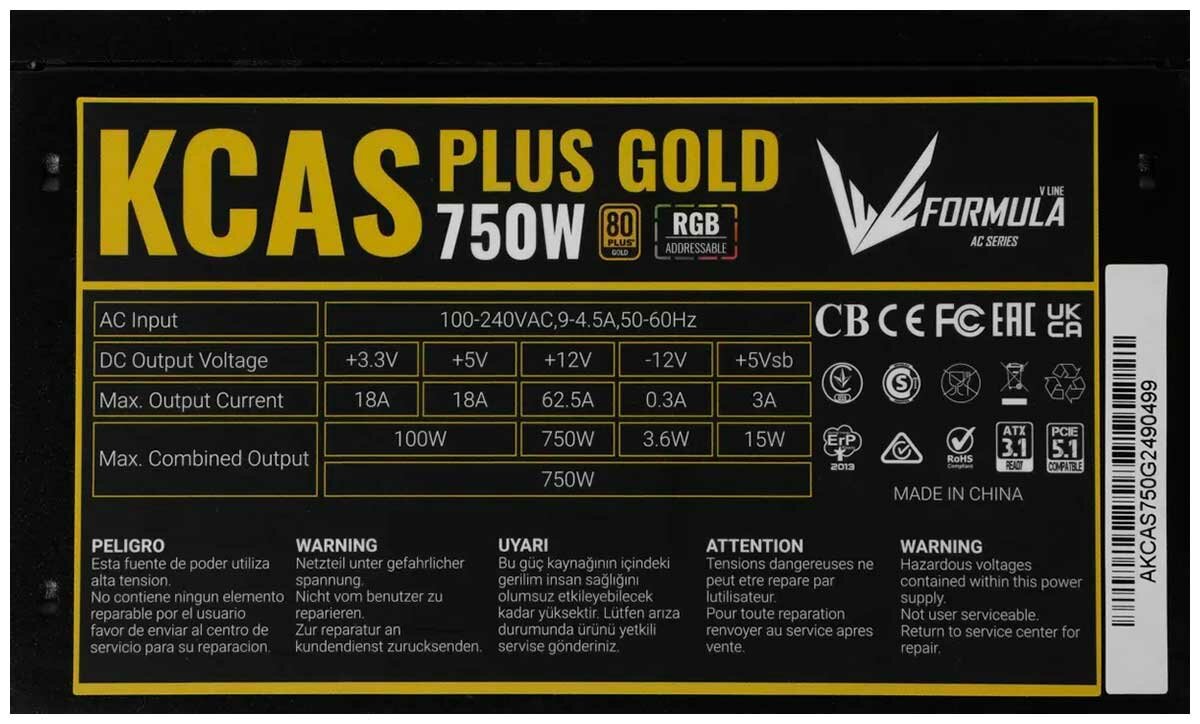 Блок питания Formula ATX 750W AC-KCAS Plus Gold 750W RGB Gold – Надежное питание для вашего компьютера