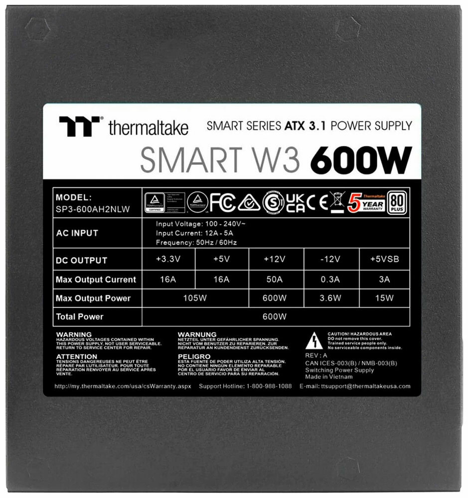 Выбирая Thermaltake 600W Smart W3, вы получаете надежного партнера для вашего компьютера, который обеспечит стабильное и эффективное питание на долгие годы. Почувствуйте уверенность в стабильности вашей системы и наслаждайтесь бесперебойной работой благодаря этому качественному блоку питания.