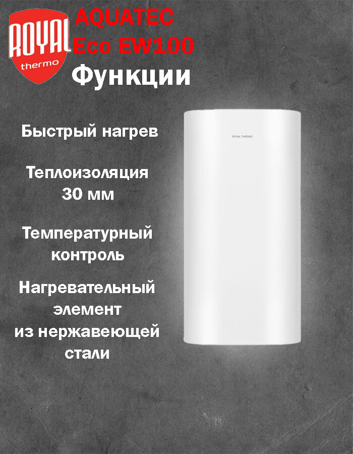 Приобретите Royal Thermo Aquatec Eco EW100 сегодня и ощутите все преимущества современного водонагревательного оборудования. Мы предлагаем выгодные условия покупки, быструю доставку и квалифицированную консультацию специалистов. Не упустите возможность обеспечить свой дом надежным источником горячей воды!