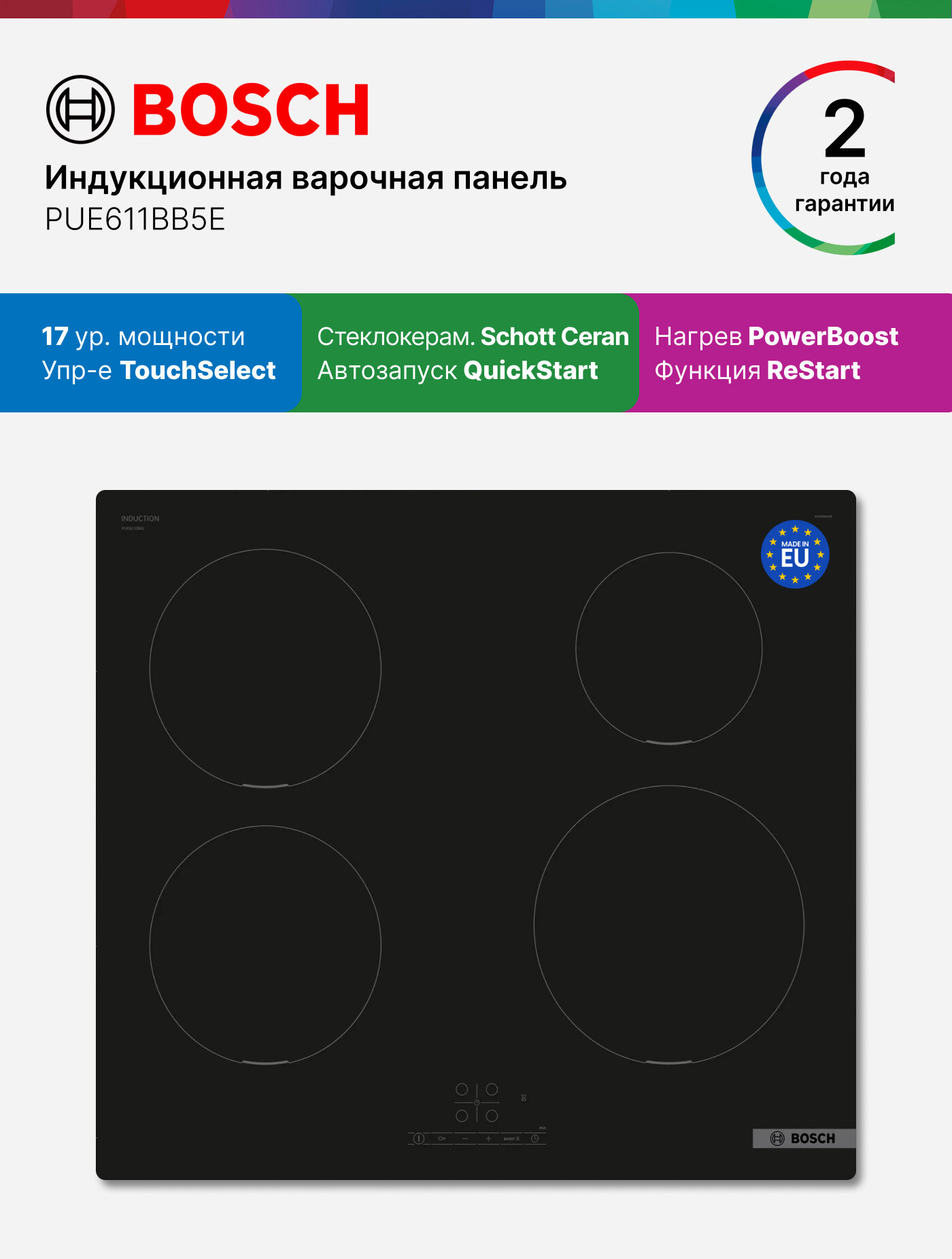 Представляем вашему вниманию Bosch PUE611BB5E Serie 4 – современную индукционную варочную панель, которая станет незаменимым помощником на вашей кухне. Эта панель сочетает в себе элегантный дизайн, передовые технологии и исключительную производительность, позволяя готовить любимые блюда быстро, легко и с удовольствием.