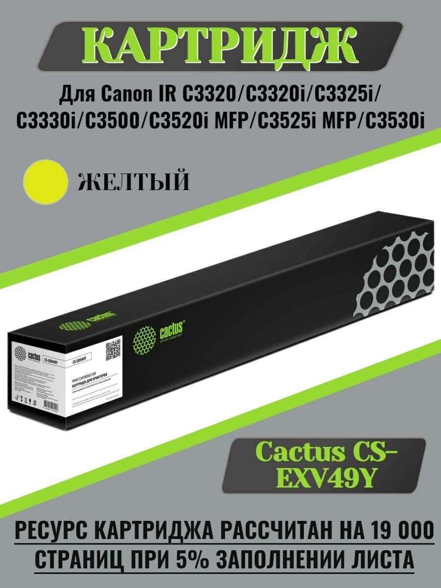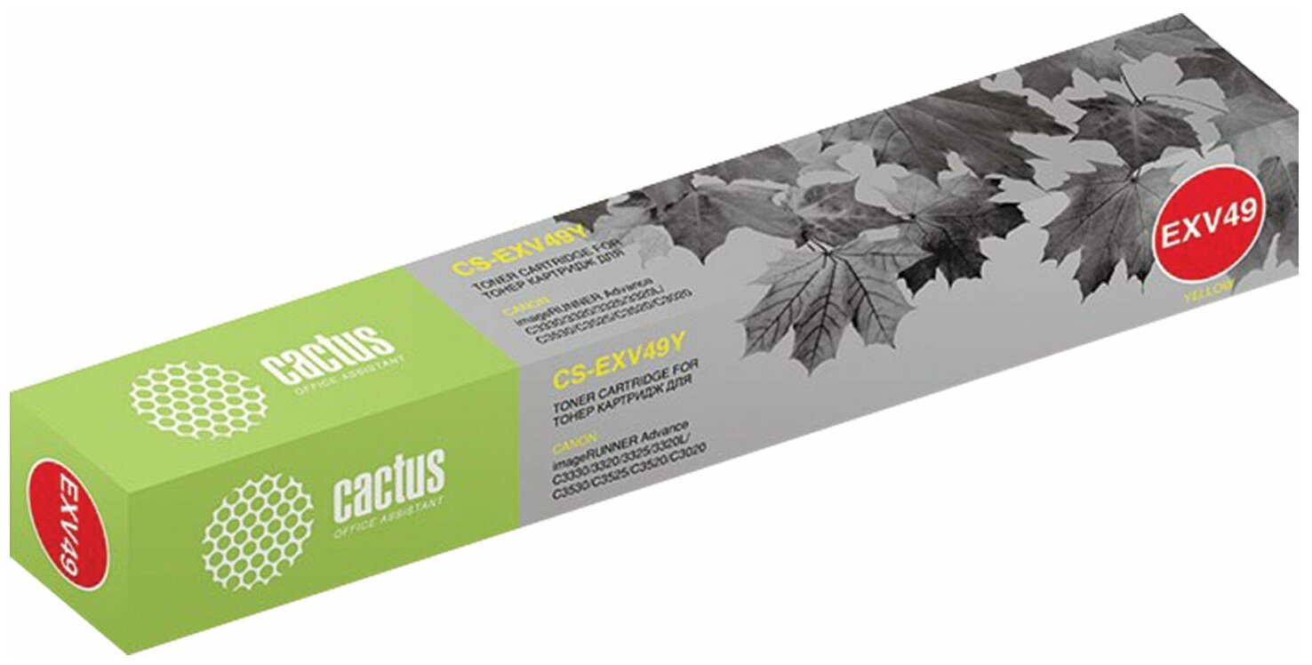 Этот совместимый картридж разработан специально для работы с определенными моделями принтеров Canon, обеспечивая безупречную совместимость и стабильную работу. Вам не придется беспокоиться о проблемах с установкой или низком качестве печати. Cactus CS-EXV49Y гарантирует четкий и яркий текст, а также насыщенные изображения, делая его идеальным решением для печати документов, отчетов и других важных материалов.
