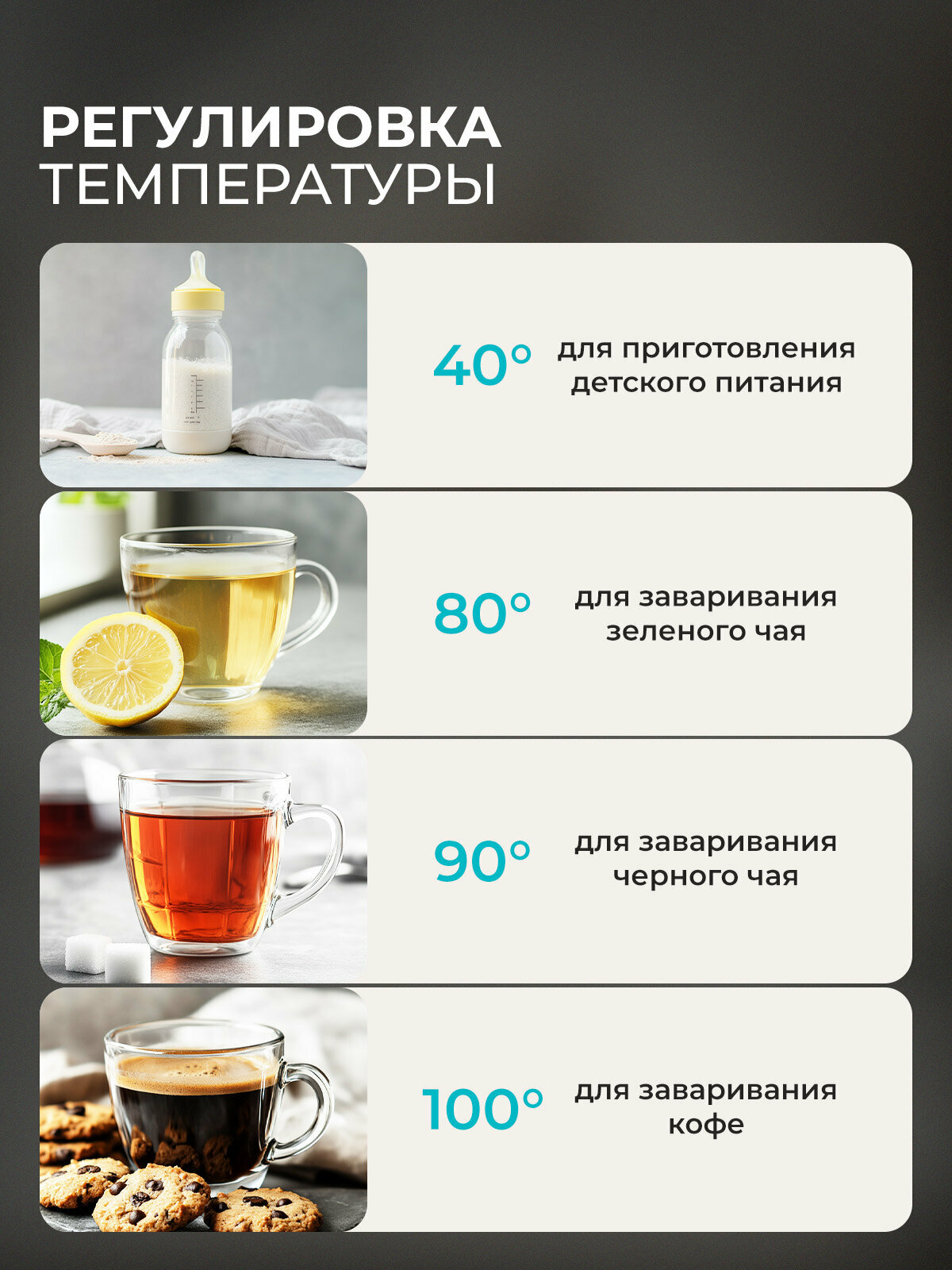 Мы позаботились о вашей безопасности. Чайник оснащен надежной системой защиты, которая автоматически отключает его при закипании воды или при отсутствии воды в резервуаре. Это гарантирует безопасное и долговечное использование прибора.