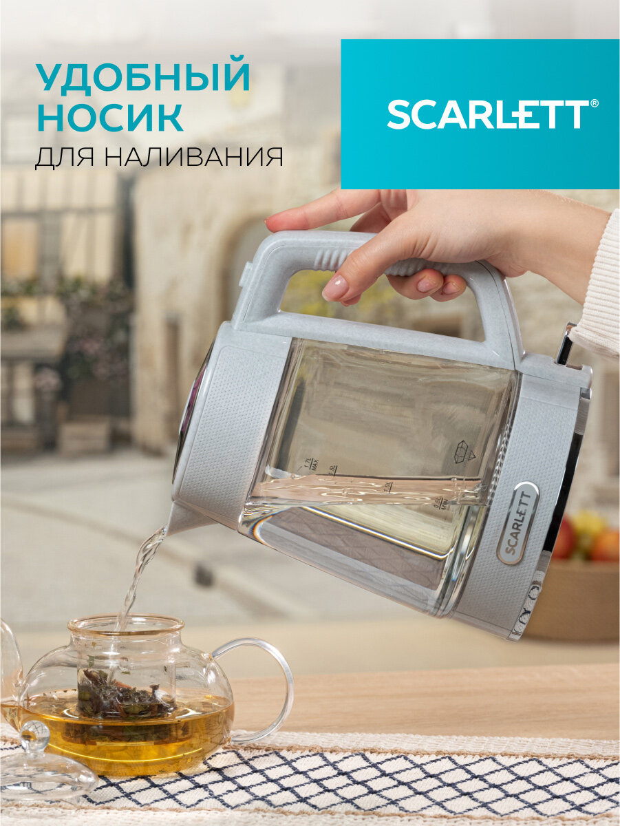 Корпус Scarlett SC-EK27G104 выполнен из высококачественного стекла, которое не только придает ему изысканный внешний вид, но и позволяет наблюдать за завораживающим процессом закипания воды. Прозрачный корпус дает вам возможность контролировать уровень воды, а также следить за чистотой чайника.