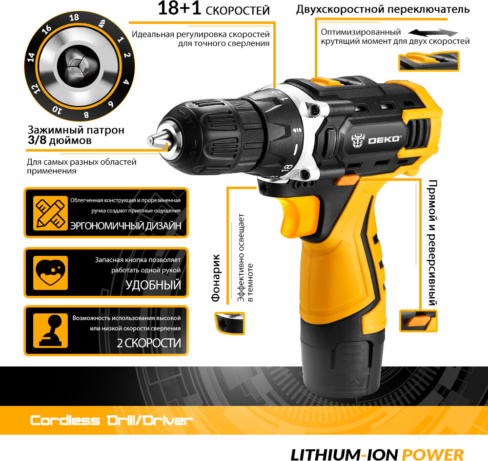 Преимущества аккумуляторной дрели-шуруповерта DEKO DKCD12FU-Li: