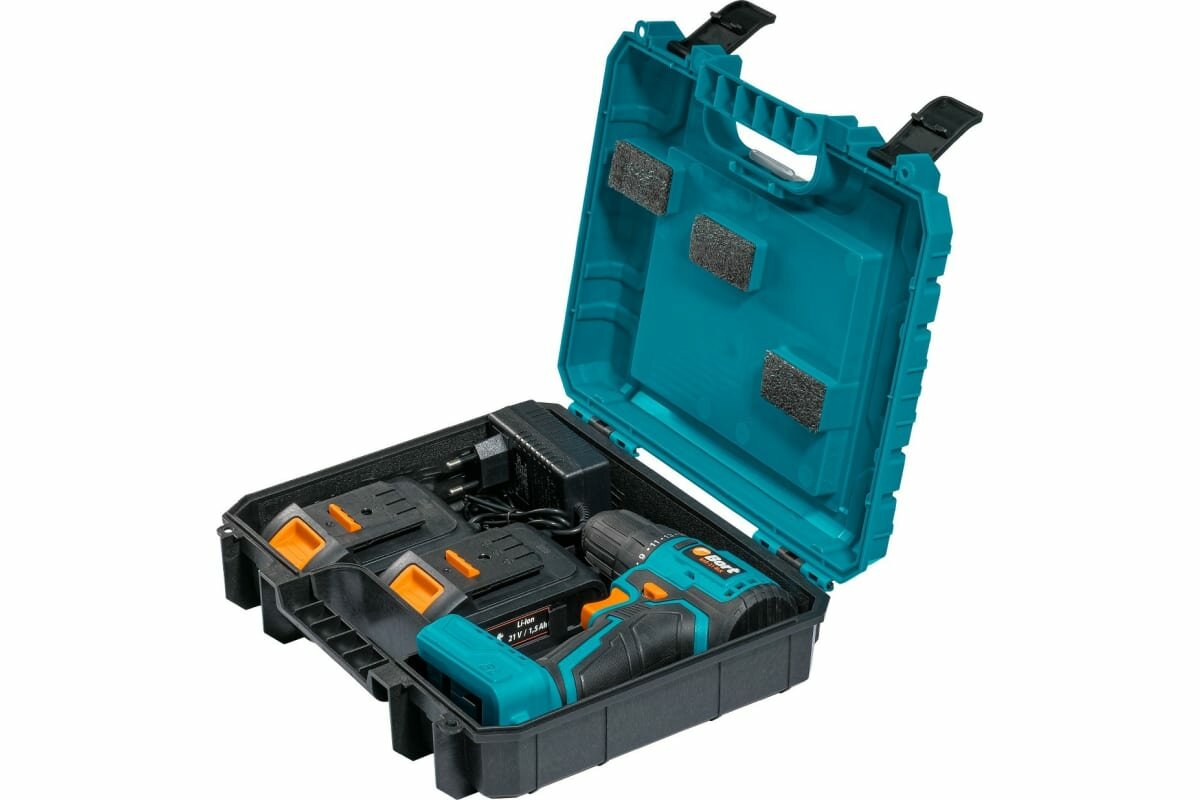 Комплектация: Дрель-шуруповерт поставляется в удобном и прочном кейсе, который обеспечивает безопасное хранение и транспортировку инструмента и аксессуаров. В комплекте также идут два аккумулятора и зарядное устройство.