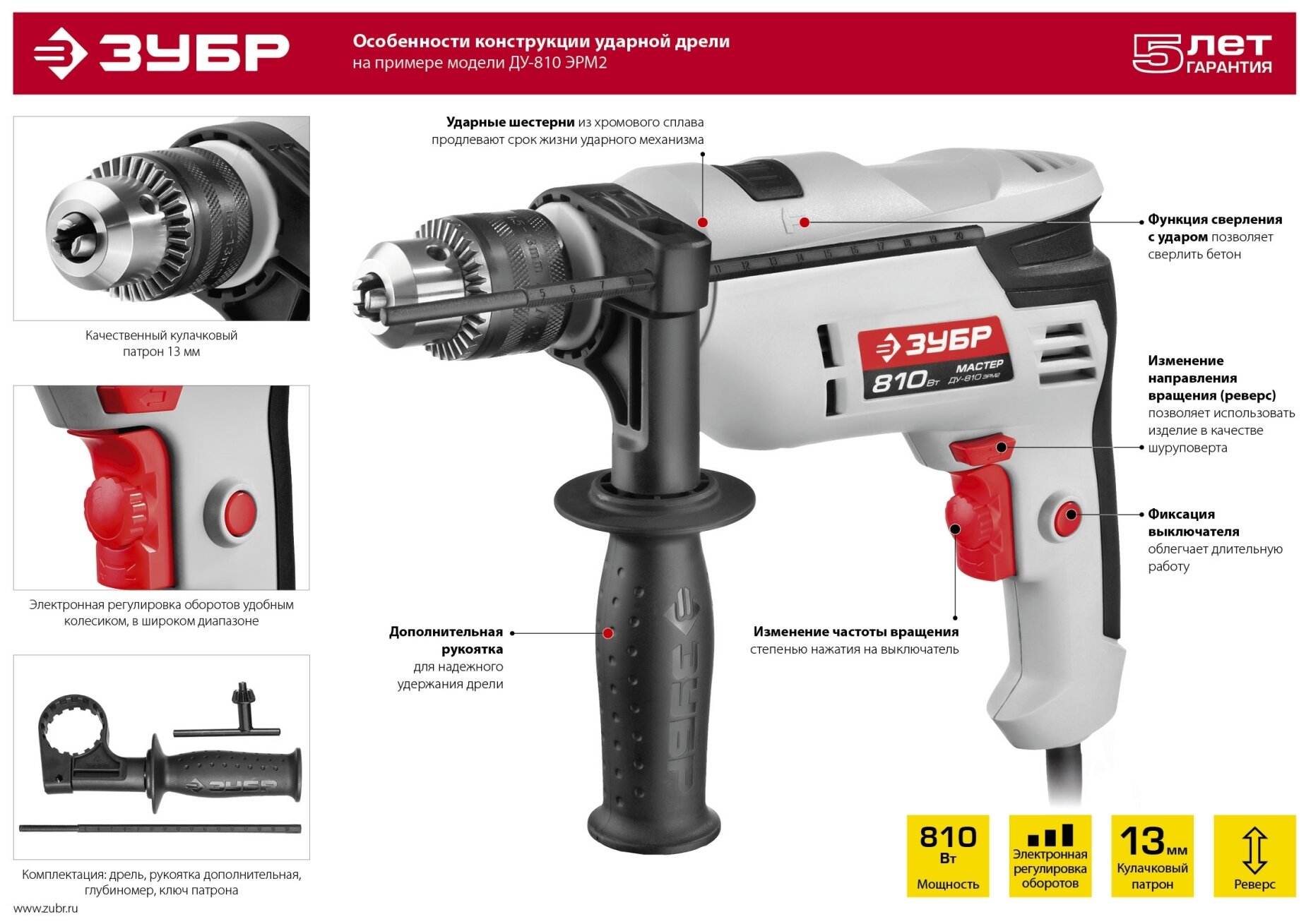 Дрель ЗУБР ДУ-810 ЭРМ2 отличается своей долговечностью и надежностью. Качественные материалы и прочная конструкция гарантируют долгий срок службы даже при интенсивной эксплуатации. Этот инструмент разработан для того, чтобы выдерживать нагрузки и обеспечивать стабильную работу в самых разных условиях.