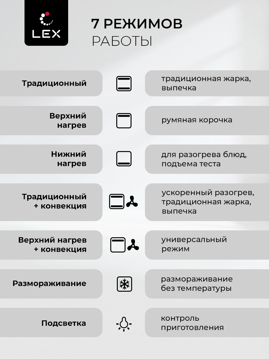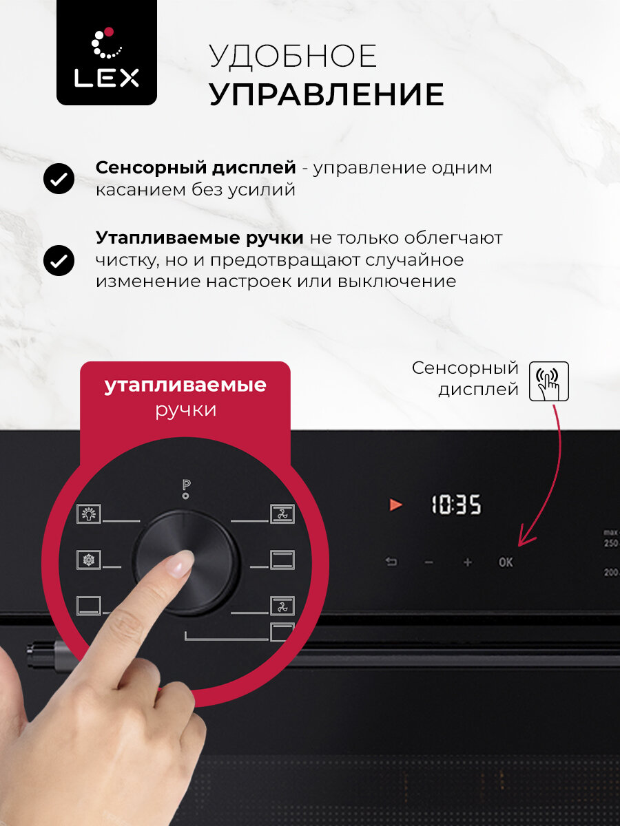 Элегантный дизайн духового шкафа Lex EDP 671 BBL прекрасно впишется в любой современный интерьер. Утапливаемые ручки и сенсорный дисплей делают управление простым и интуитивно понятным. Благодаря им вы сможете легко выбрать нужный режим, установить время приготовления и температуру.