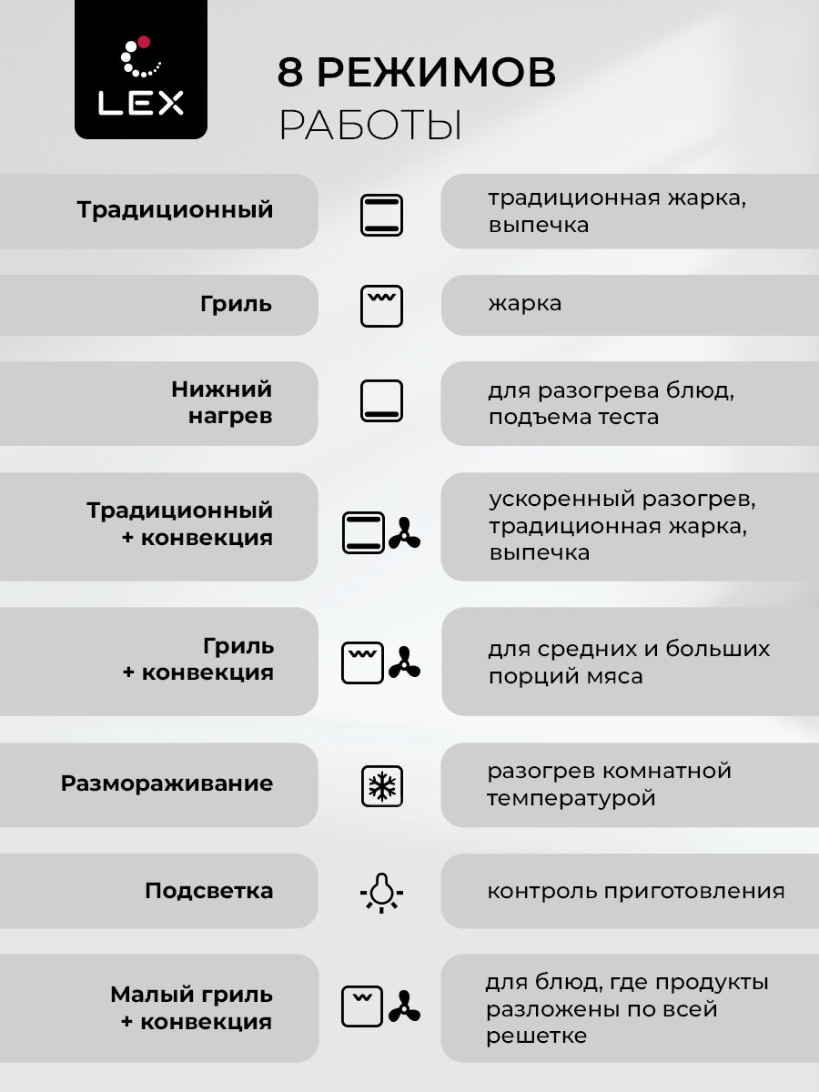 Просторная камера духового шкафа позволит вам готовить большие порции блюд для всей семьи или для приема гостей. Благодаря различным режимам работы вы сможете выбрать оптимальный режим для каждого блюда, будь то сочное мясо, ароматная выпечка или аппетитные овощи. Конвекция обеспечит равномерное распределение тепла, что гарантирует превосходные результаты приготовления.