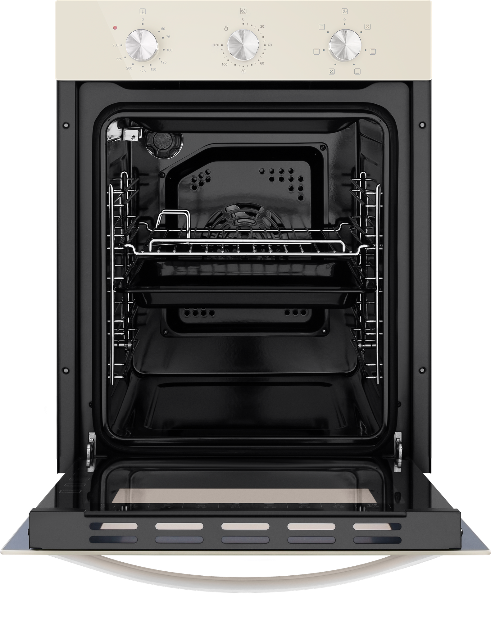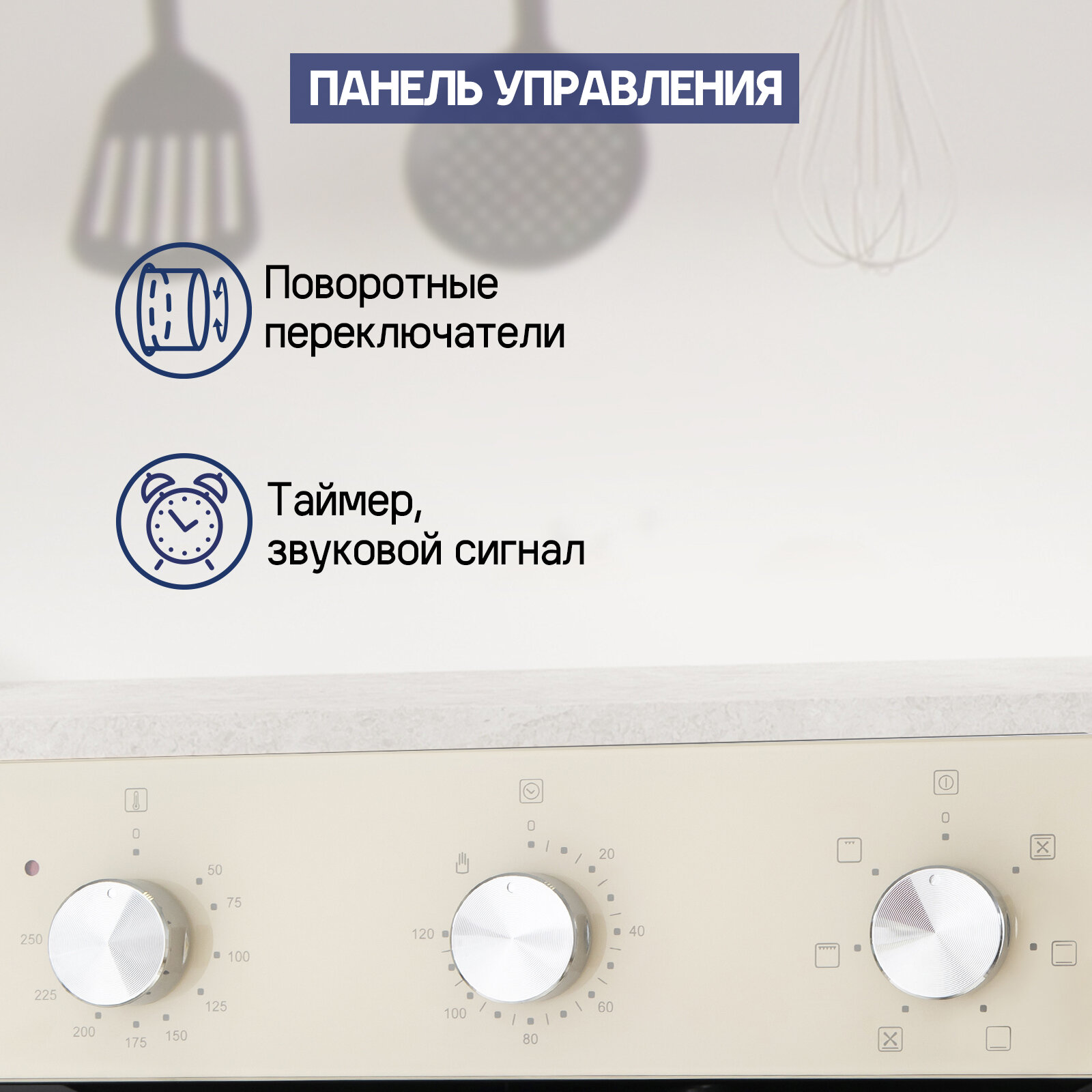 Встраиваемый дизайн позволяет интегрировать духовой шкаф в кухонный гарнитур, экономя пространство и создавая гармоничный вид. Бежевый цвет придает кухне уют и тепло, делая ее более привлекательной.