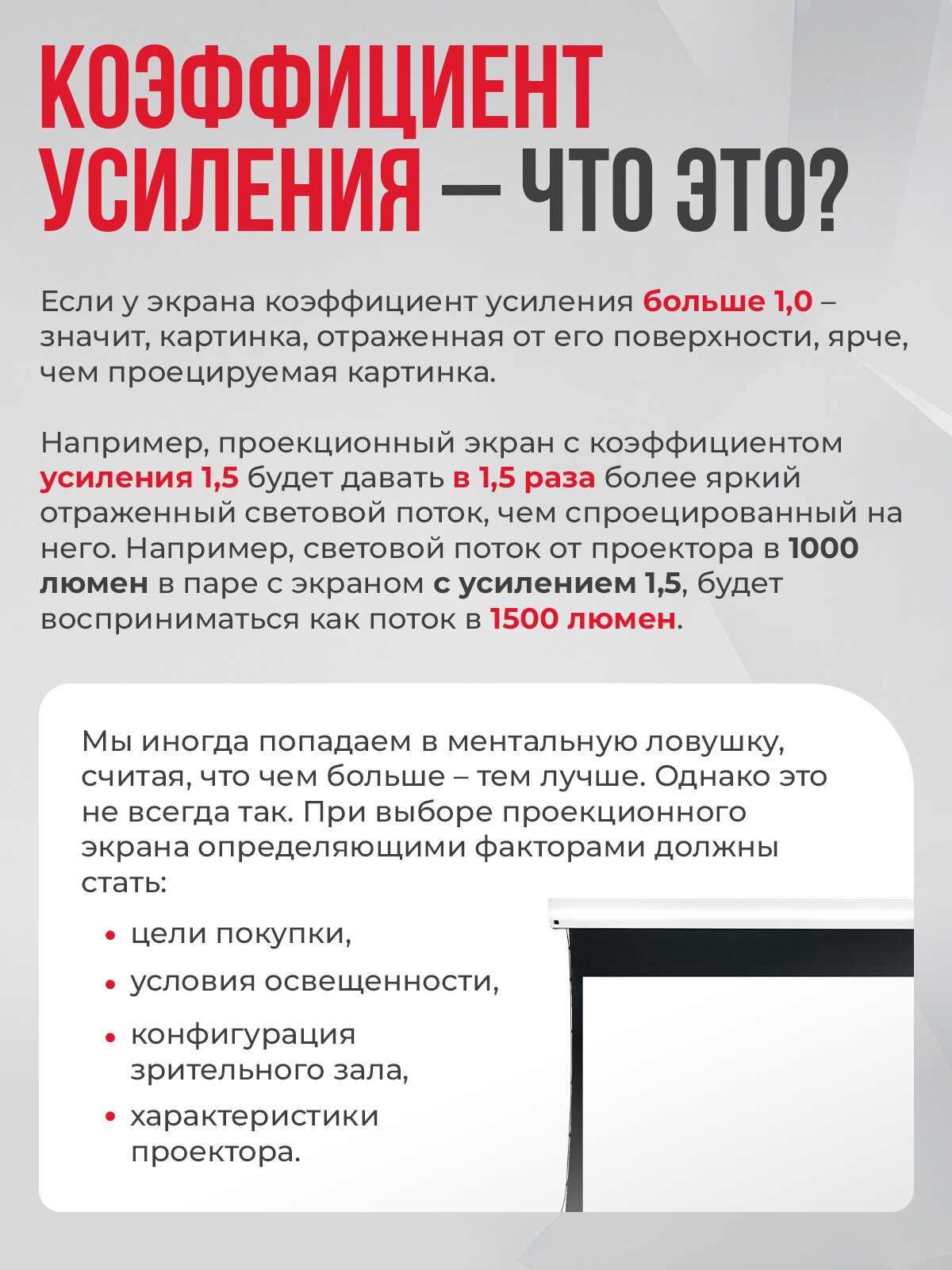 Благодаря высокому качеству материалов и сборки, экран прослужит вам долгие годы, радуя безупречным качеством изображения. Это отличный выбор для тех, кто ценит комфорт, качество и надежность.