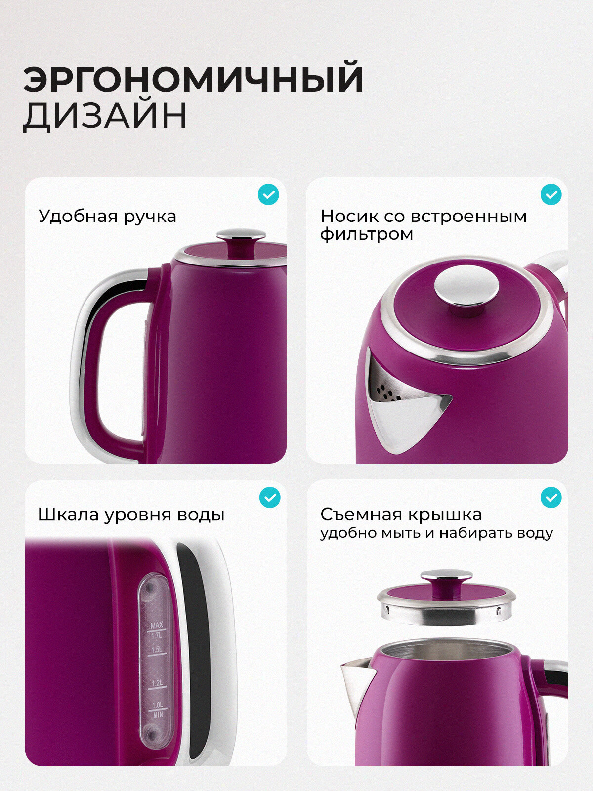Корпус чайника выполнен из качественных материалов, что гарантирует его долговечность и надежность. Элегантный малиновый цвет придает ему особый шарм и позволяет гармонично вписаться в любой интерьер. Он не только выполняет свою основную функцию, но и радует глаз своим привлекательным внешним видом.