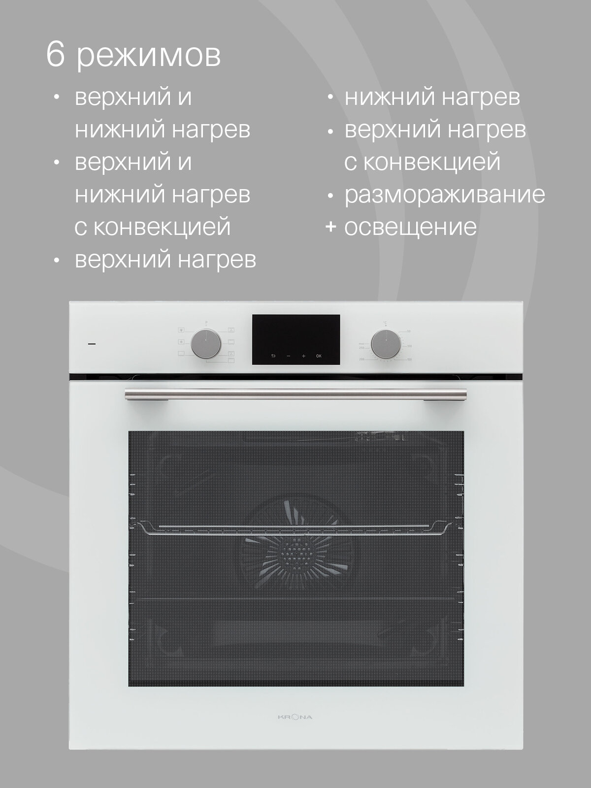 Простое и интуитивно понятное управление делает использование духового шкафа Krona Legende 60 WH максимально комфортным. Вы сможете легко выбрать необходимый режим, установить температуру и время приготовления.