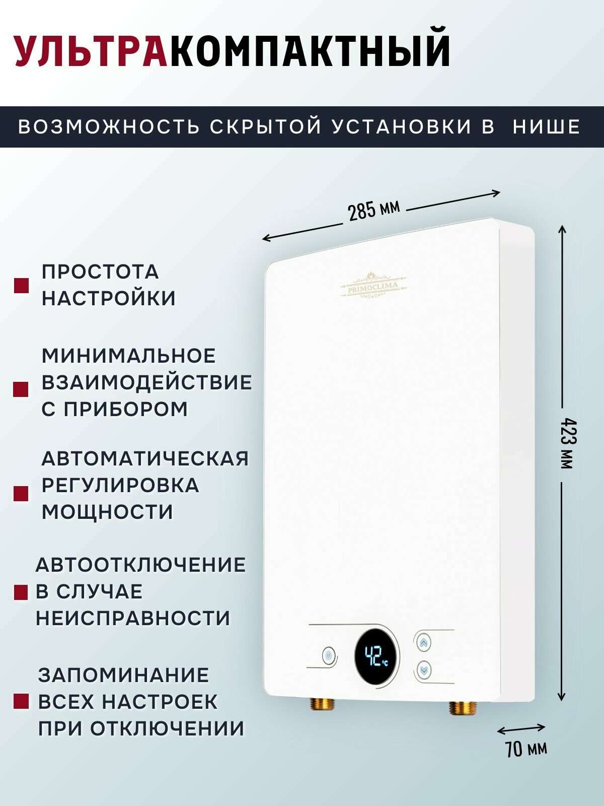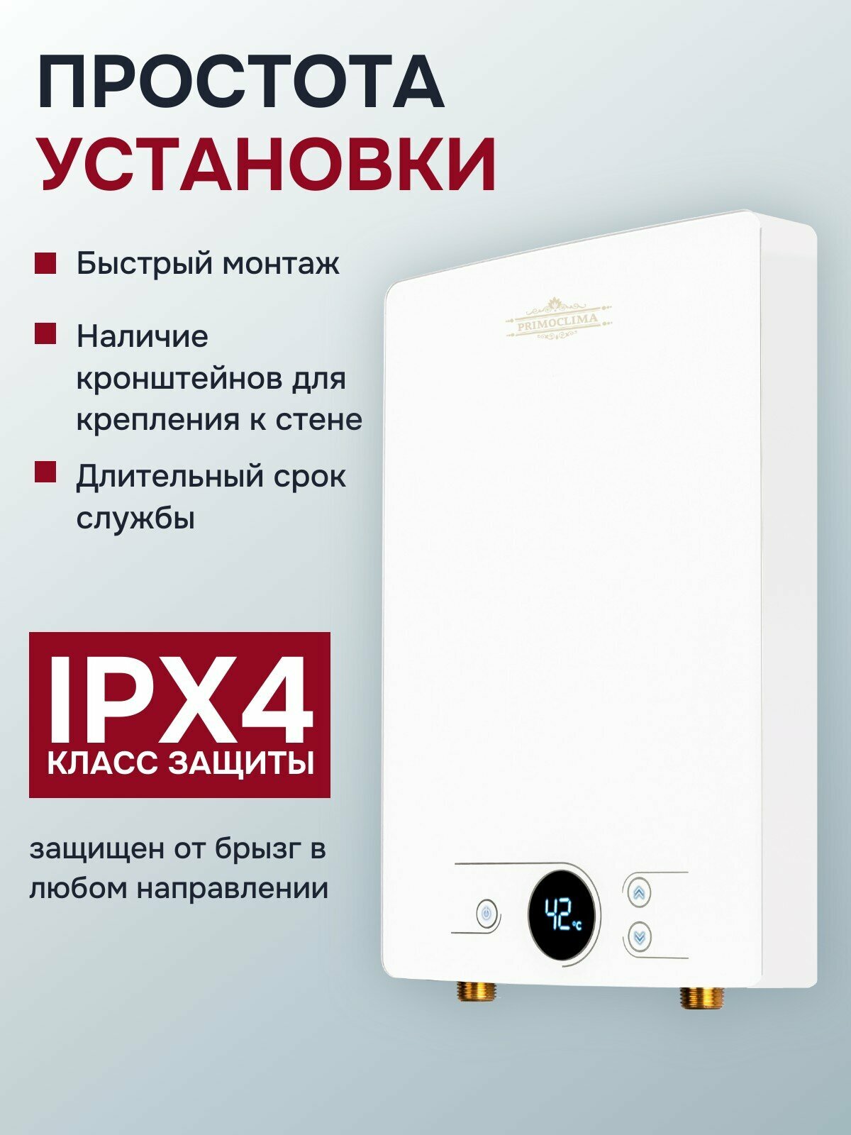 Простота установки и эксплуатации делают PrimoClima Amor отличным выбором для тех, кто ценит комфорт и удобство. Вам не потребуется специальных навыков для подключения и использования водонагревателя.