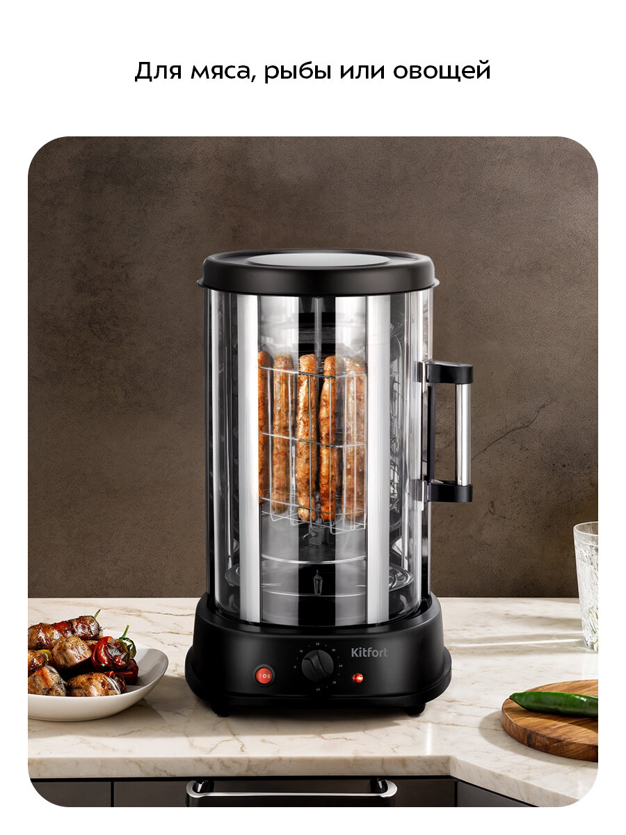 Электрошашлычница Kitfort KT-1411 обеспечивает равномерное прожаривание мяса, рыбы или овощей, сохраняя их сочность и восхитительный вкус. Благодаря продуманной конструкции и качественным материалам, шашлык получается нежным, ароматным и аппетитным, словно только что снятый с мангала.