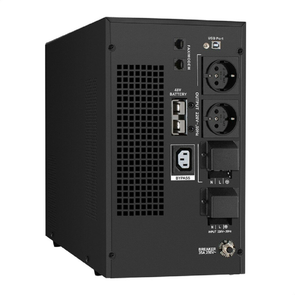ИБП оснащен различными выходными разъемами, включая Schuko, C13 и клеммы для подключения к различному оборудованию. Также предусмотрены порты RJ45/11 и USB для защиты сетевого оборудования и связи с компьютером.