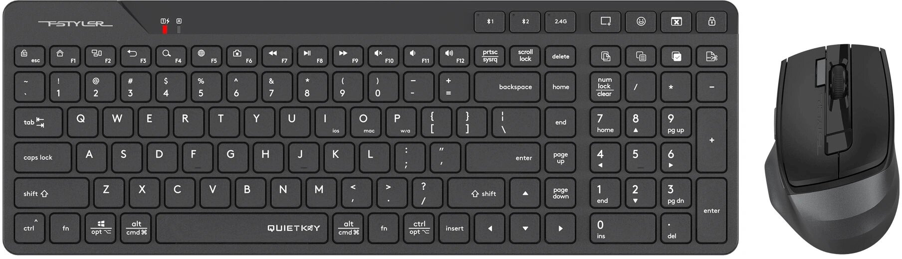 Цветовая гамма комплекта – сочетание черного и серого – выглядит современно и стильно, позволяя ему гармонично вписаться в любой интерьер рабочего места. Комплект A4Tech Fstyler FB2800C Air2 – это не только функциональный инструмент, но и стильный аксессуар, подчеркивающий ваш вкус.