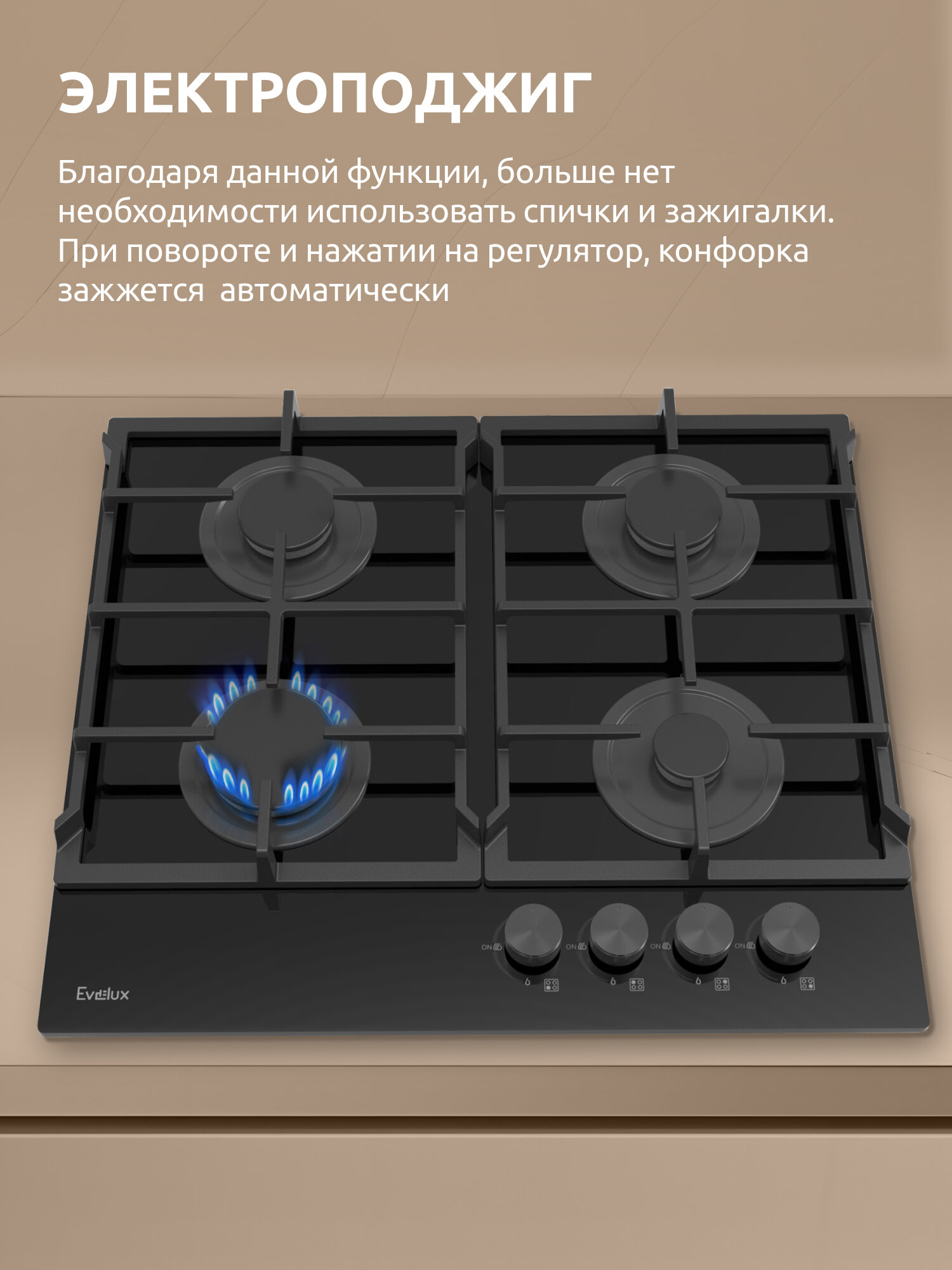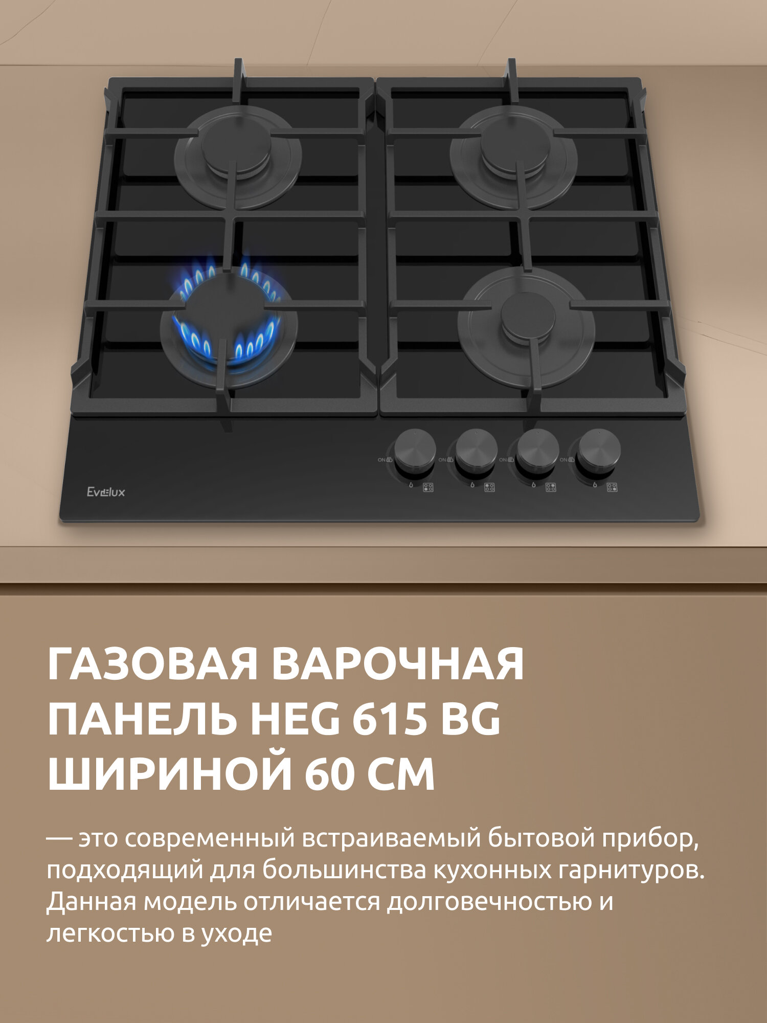 Ищете надежную и элегантную газовую варочную панель, которая станет украшением вашей кухни и облегчит процесс приготовления пищи? Evelux HEG 615 BG – это отличный выбор для тех, кто ценит сочетание современного дизайна и практичности. Эта варочная панель шириной 60 см идеально впишется в любую кухню, будь то просторная или компактная.
