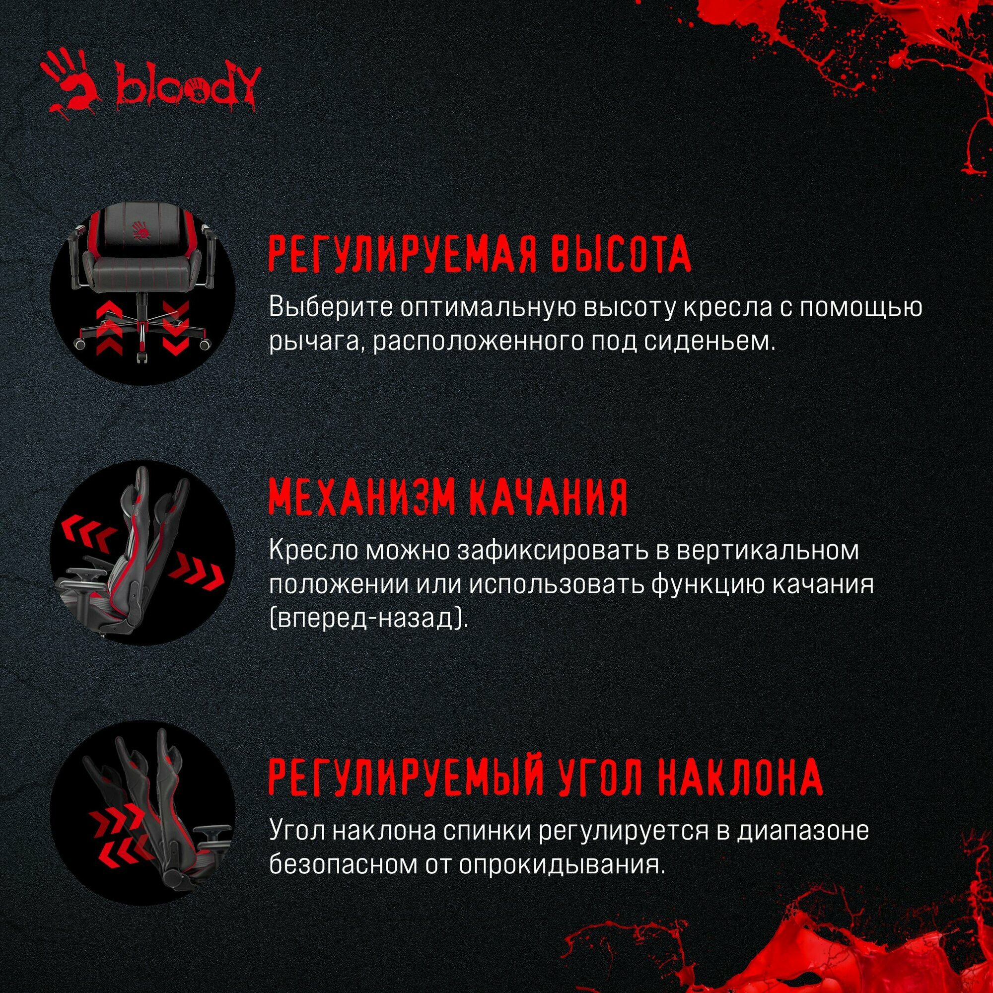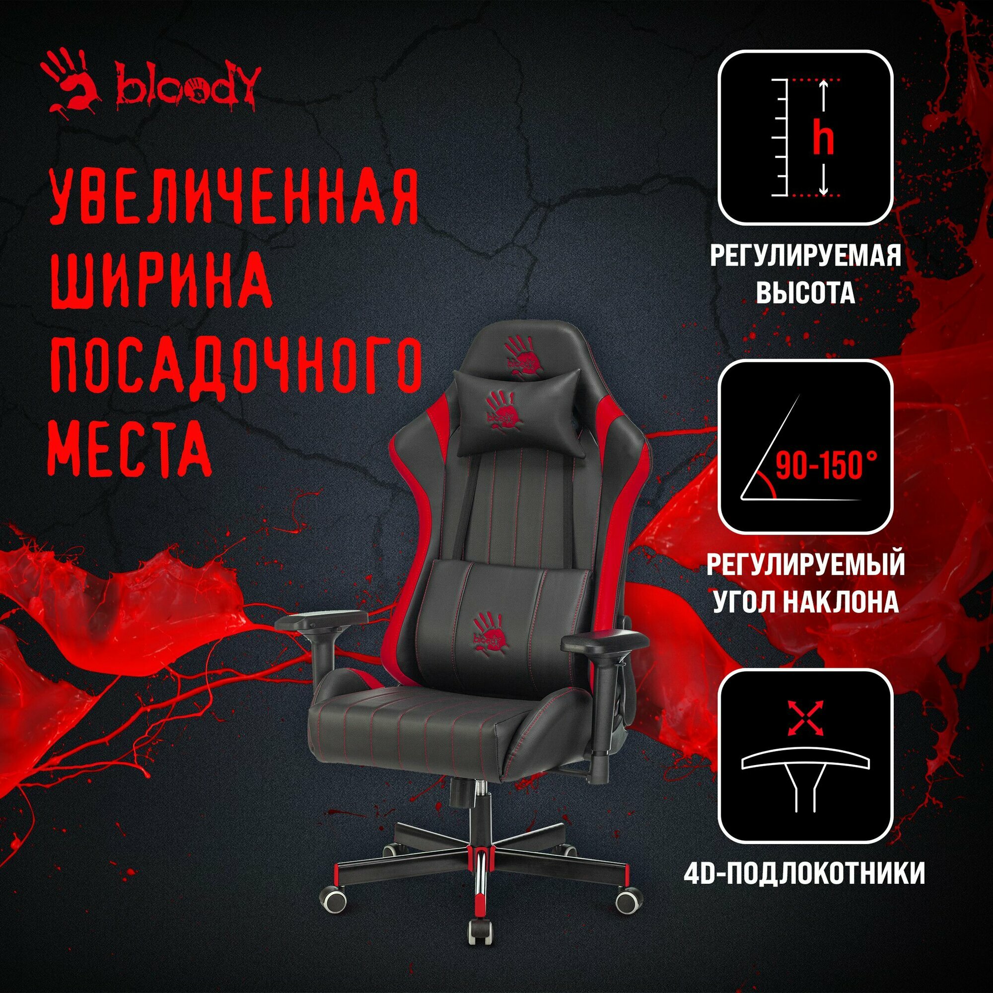 Игровые кресла Bloody с передовой эргономикой для продолжительных игровых сессий Тактильно комфортные, долговечные, гипоаллергенные материалы обивки, обеспечивают оптимальный теплообмен и абсолютный комфорт в течение всего срока службы. В основе конструкции кресел каркас из высокопрочной трубы защищенный от коррозии и надежные усиленные механизмы-реклайнеры. 3D подлокотники. Регулируются по высоте; накладки поворачиваются в горизонтальной плоскости (влево-вправо, вперед-назад). Крестовина изготовлена из высокопрочной стали с яркими пластиковыми накладками, что позволяет выдерживать высокие и продолжительные нагрузки. Дизайн и конструкция кресел обеспечивают максимальный комфорт во время игры, снижают нагрузку на спину и способствуют поддержке осанки. Тип установки: на колесиках Подлокотники: есть Тип подлокотников: регулируемые в четырех плоскостях Крестовина: металлическая + пластиковые вставки Механизм качания: есть, с фиксацией в вертикальном положении Регулировка высоты (газлифт): есть Регулировка наклона спинки: есть Материал обивки: экокожа Ограничения по весу: 181 кг