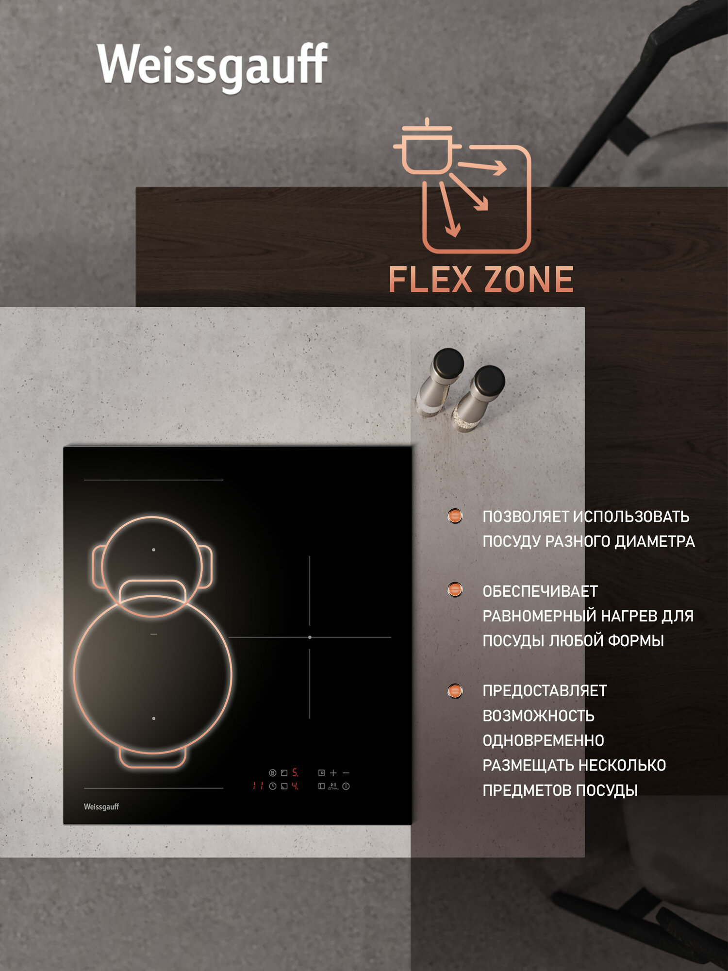 Одной из ключевых особенностей этой модели является наличие Flex Zone. Эта функция позволяет объединить две конфорки в одну большую, что идеально подходит для использования крупной посуды, например, утятницы или сковороды-гриль. Вы сможете готовить большие порции блюд для всей семьи без каких-либо ограничений.