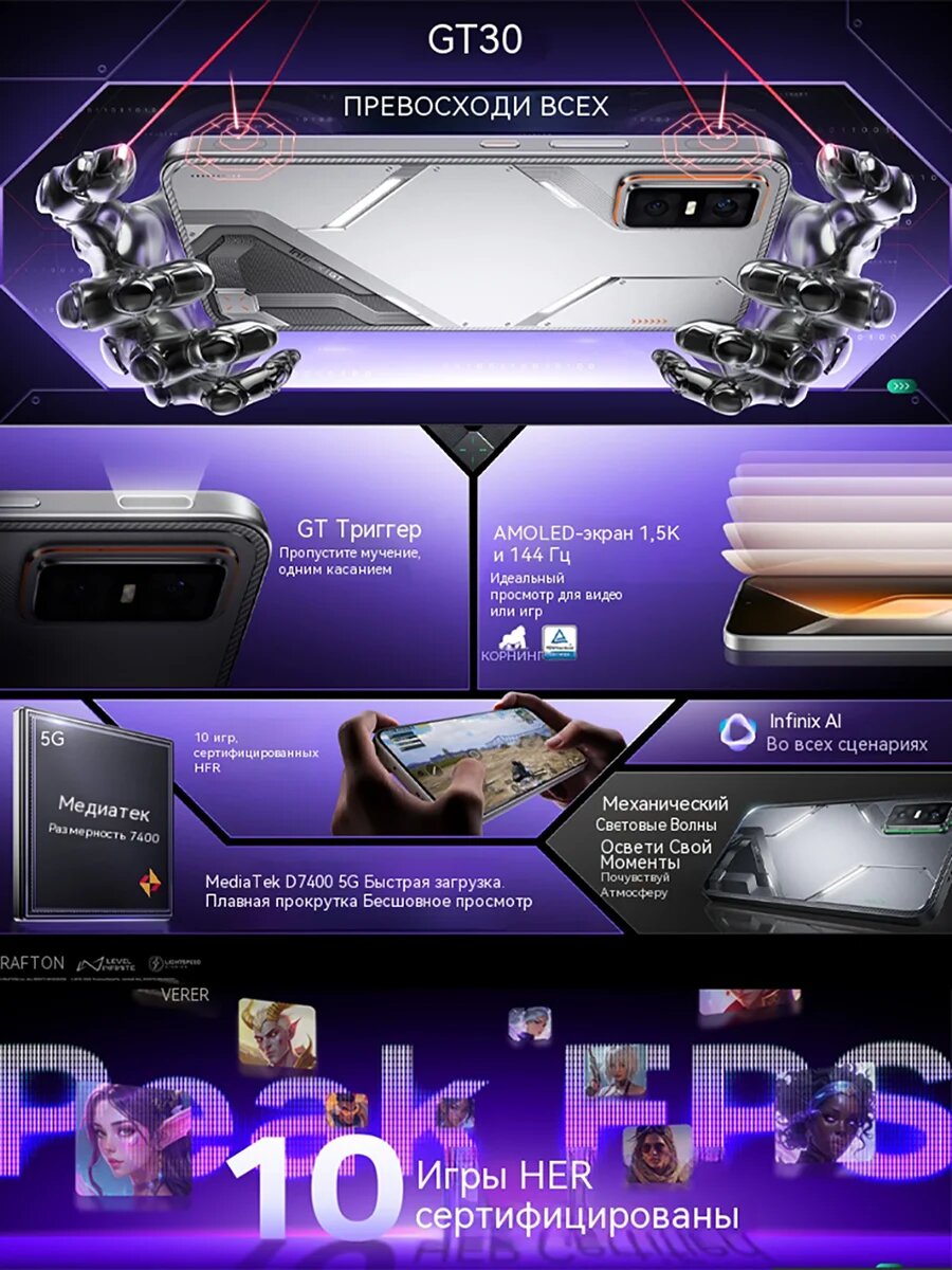 Infinix GT 30 5G – это отличный выбор для тех, кто ищет современный и функциональный смартфон с ярким дизайном и высокой производительностью. Откройте для себя новые возможности с этим потрясающим устройством!