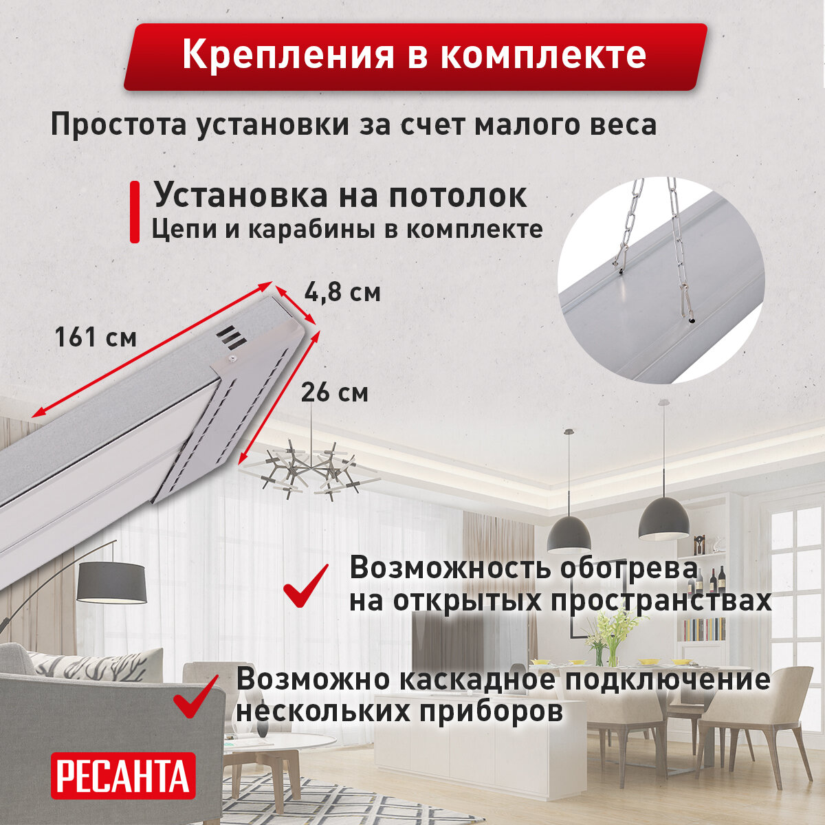 Благодаря потолочному креплению, обогреватель РЕСАНТА ИКО-2000 ТЕН экономит полезное пространство и обеспечивает равномерное распределение тепла по всей площади помещения. Он идеально подходит для обогрева больших комнат, складов, гаражей и других помещений, где требуется эффективный и экономичный обогрев.