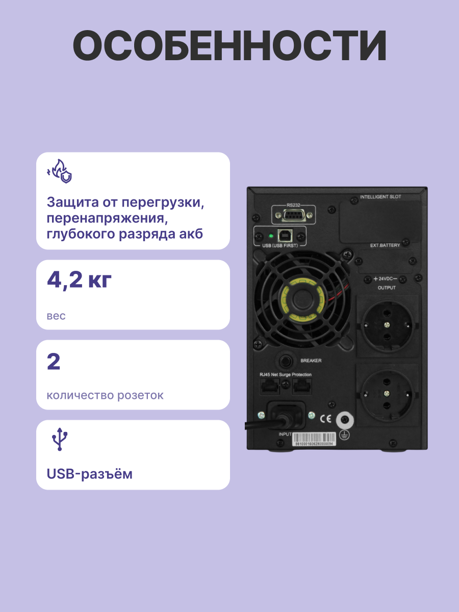 Благодаря своей конструкции, этот ИБП обеспечивает мгновенное переключение на батарейное питание в случае пропадания электроэнергии, исключая любые простои и потерю данных. Вы можете быть уверены, что ваши важные процессы не будут прерваны, а ваши устройства будут надежно защищены.