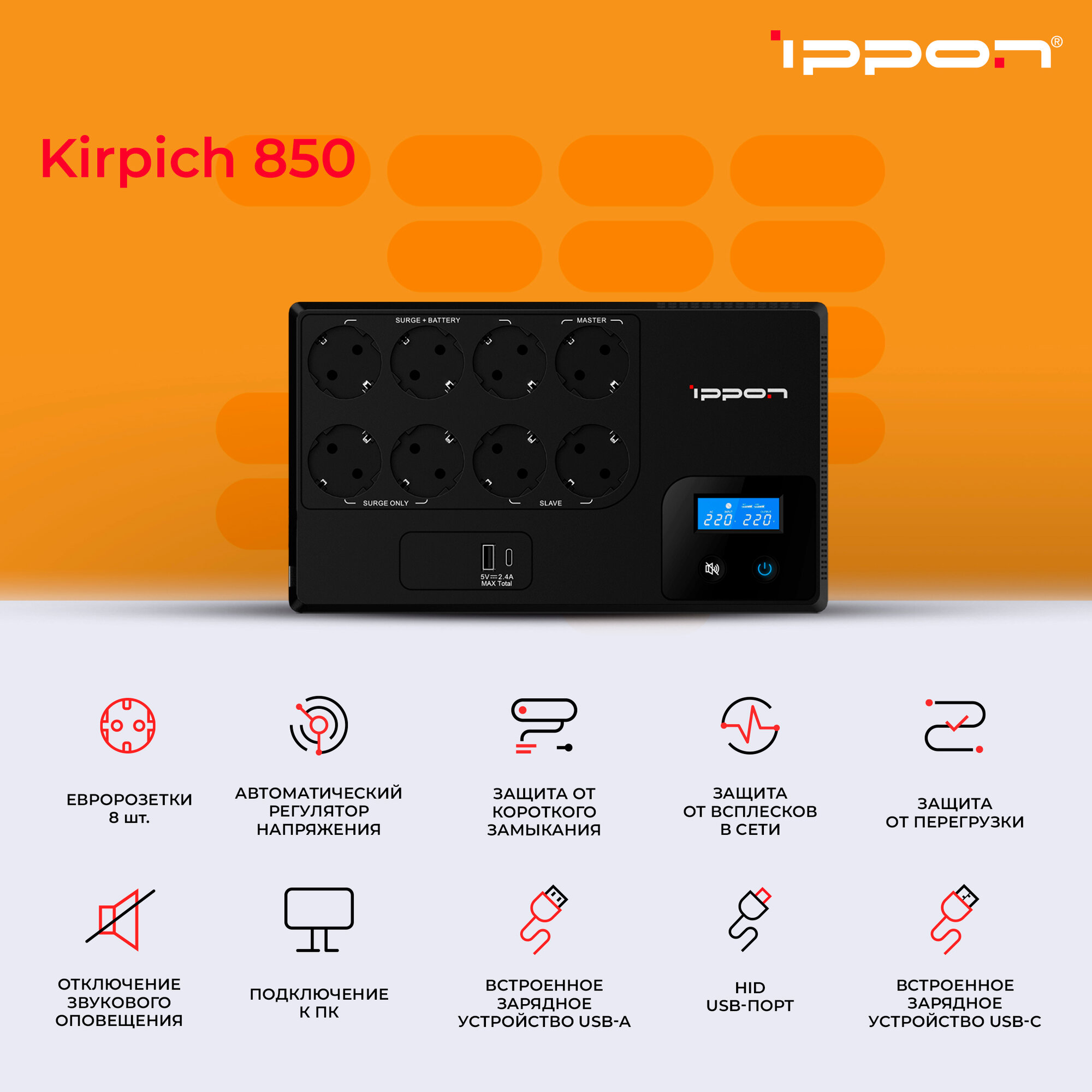 IPPON Kиrpich 850 отличается простотой в использовании и подключении. Он компактен и не займет много места, легко впишется в любой интерьер. Это ваш надежный помощник в обеспечении непрерывной работы электроники, гарантирующий сохранность важной информации и долговечность вашей техники. Забудьте о страхе потерять данные или повредить оборудование из-за перепадов напряжения!