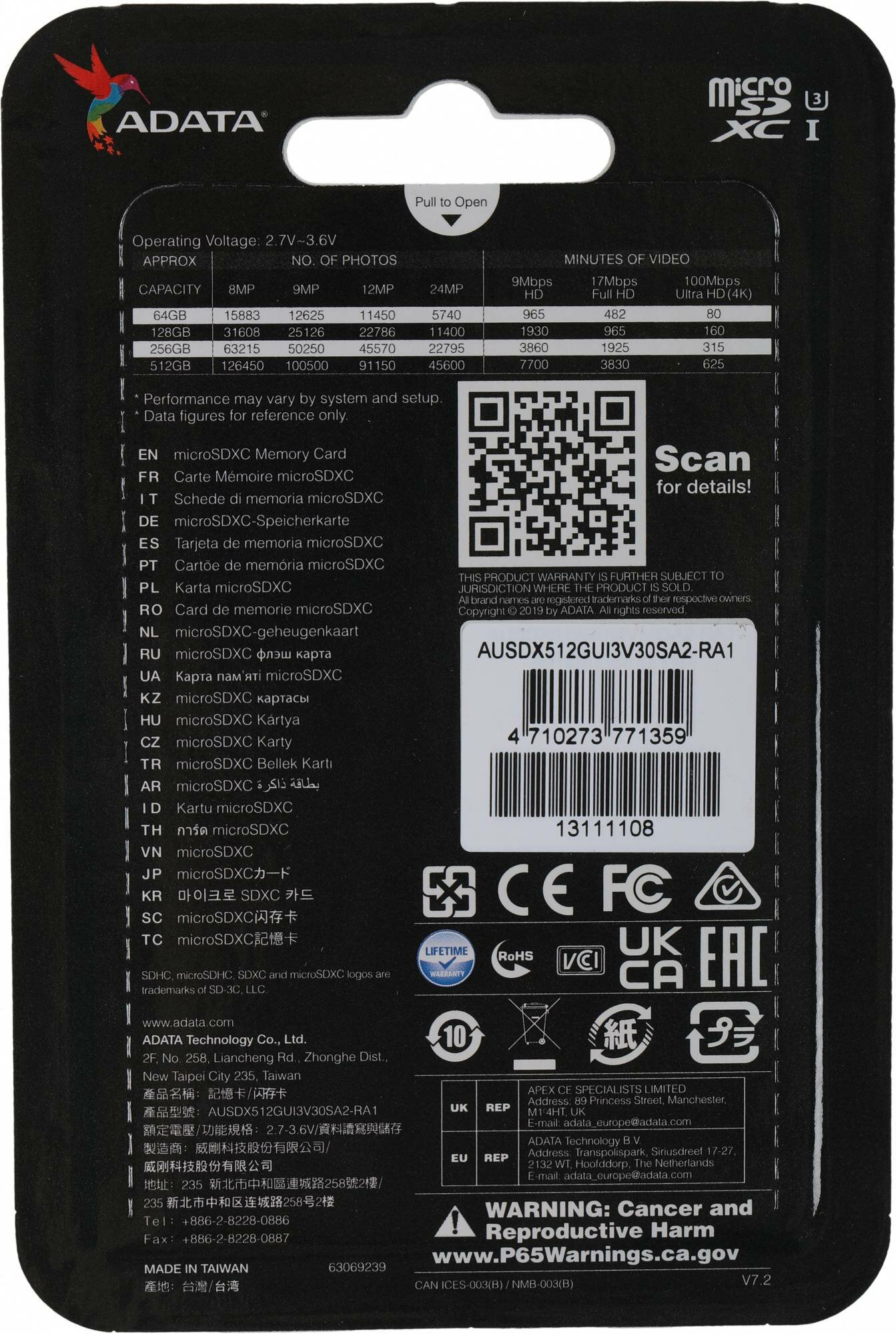 Adata Micro SDXC Premier Pro – это не только вместительность, но и высокая скорость передачи данных. Она обеспечит плавную и быструю запись и чтение файлов, что особенно важно при работе с ресурсоемкими приложениями и съемке видео высокого разрешения. Вы сможете мгновенно сохранять фотографии, записывать видео без задержек и быстро передавать файлы на другие устройства.