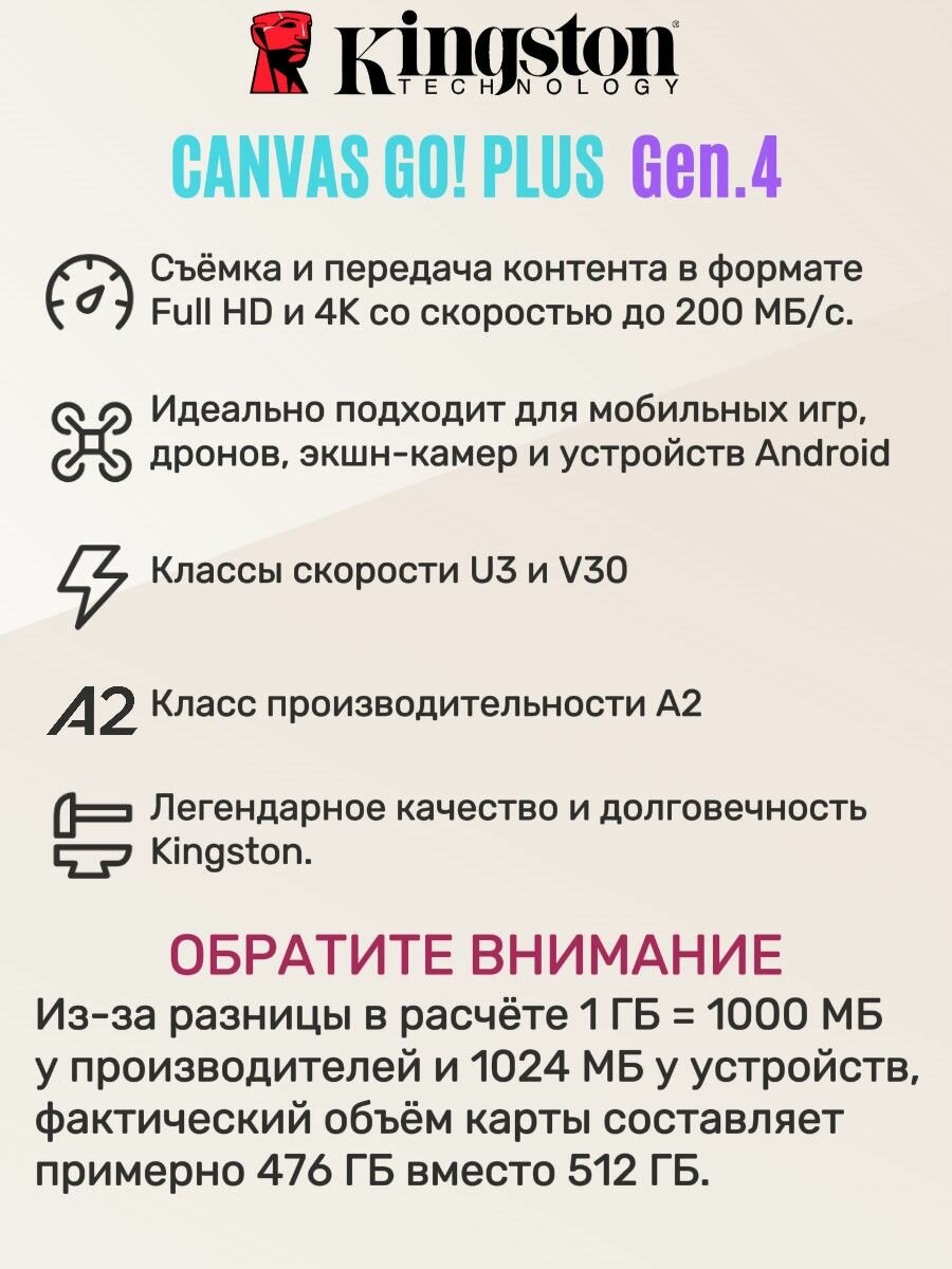Ищете надежное и быстрое решение для хранения ваших данных? Карта памяти microSD Kingston Canvas Go! Plus Gen4 объемом 512 ГБ – это идеальный выбор для тех, кто ценит скорость и большой объем памяти в компактном формате. Эта карта памяти позволит вам запечатлеть самые важные моменты вашей жизни в высоком разрешении, будь то фотографии, видео или аудиозаписи.