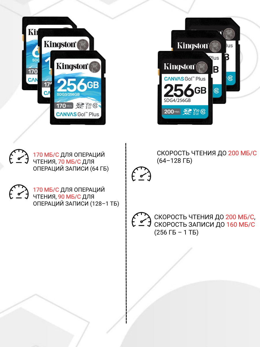 Карта памяти SD 512GB Kingston Canvas Go! Plus Gen4 – это не просто хранилище данных, это инвестиция в ваш комфорт и производительность. Она станет незаменимым помощником для всех, кто ценит скорость, надежность и большой объем памяти. Расширьте возможности ваших устройств и откройте для себя мир безграничных возможностей с Kingston Canvas Go! Plus Gen4!