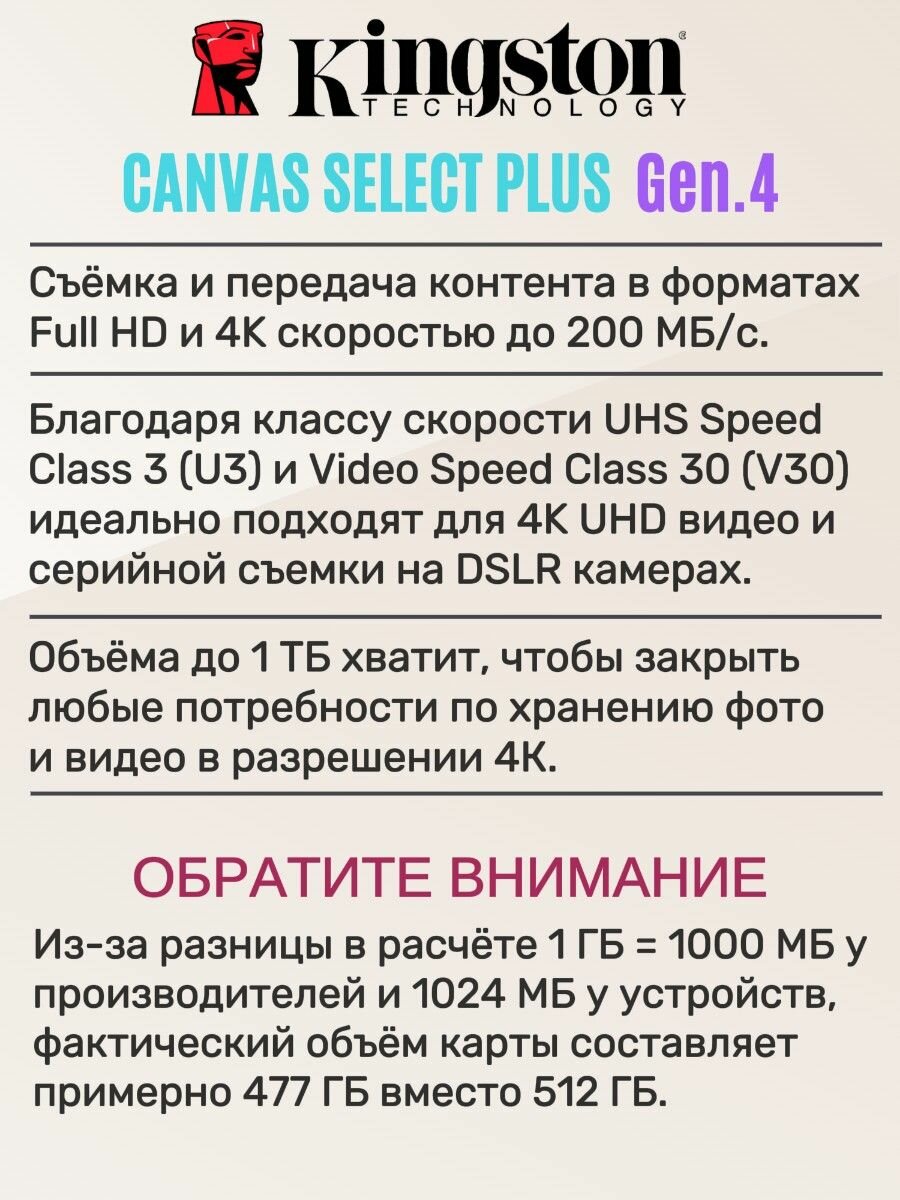 Вы фотограф, видеограф, геймер или просто активный пользователь, которому постоянно не хватает места на устройствах? Карта памяти SD 512GB Kingston Canvas Go! Plus Gen4 - это идеальное решение для тех, кто стремится к большему! Она предоставляет огромный объем памяти, позволяя забыть о постоянной необходимости удалять файлы и освобождать место.