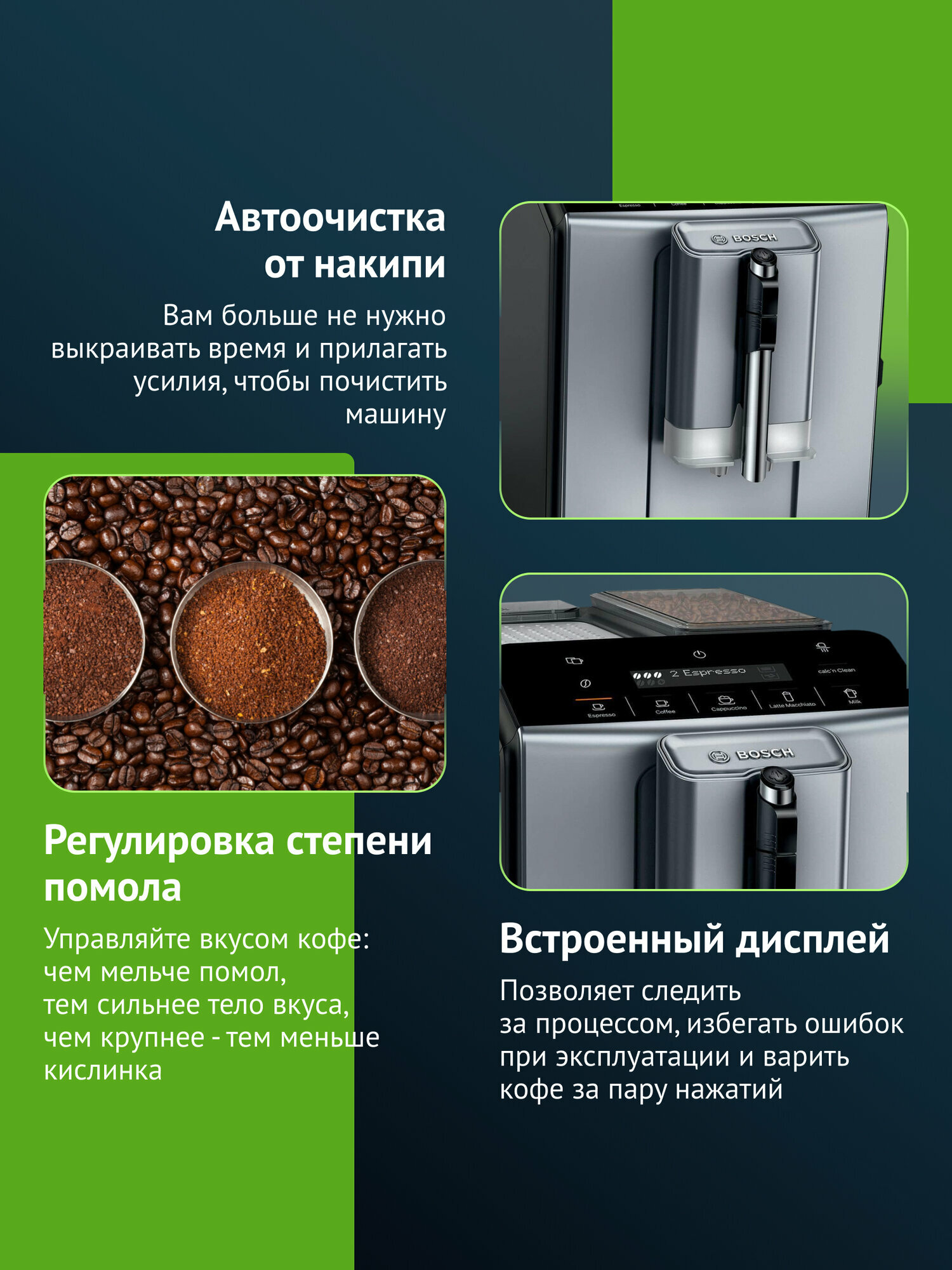 Позвольте себе наслаждаться настоящим кофейным ритуалом с Bosch TIE20504. Эта кофемашина создана для тех, кто ценит качество, комфорт и безупречный вкус. Превратите свой дом в уютную кофейню, где всегда найдется место для чашечки ароматного кофе и приятной беседы.