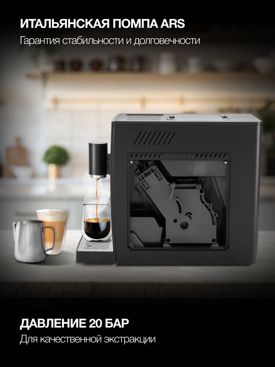 Эта элегантная кофемашина в стильном черном корпусе станет настоящим украшением вашей кухни. Она сочетает в себе современный дизайн и передовые технологии, позволяя вам наслаждаться превосходным вкусом свежесваренного кофе каждый день.