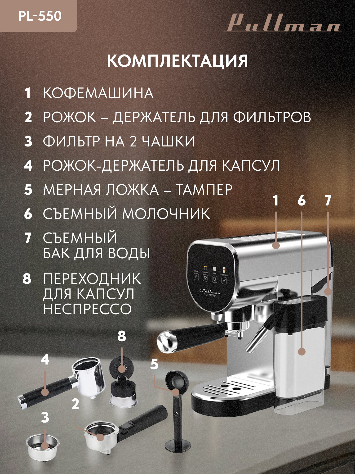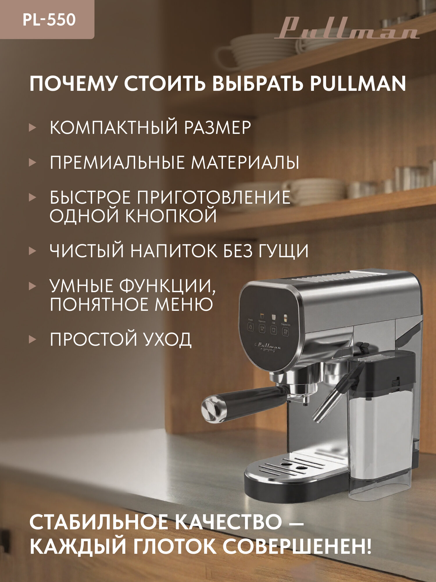 Pullman PL-550 – это не просто кофеварка, это ваш личный кофейный бар в миниатюре! Позвольте себе роскошь наслаждаться превосходным кофе каждый день.